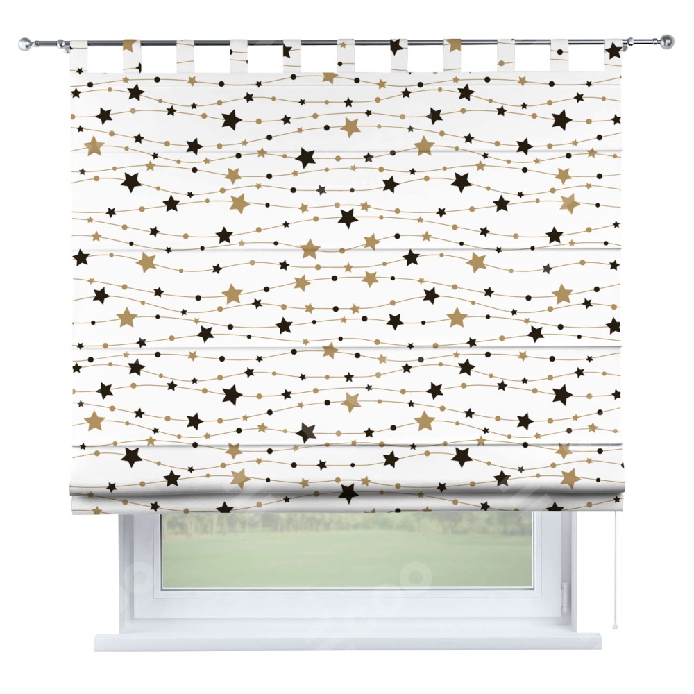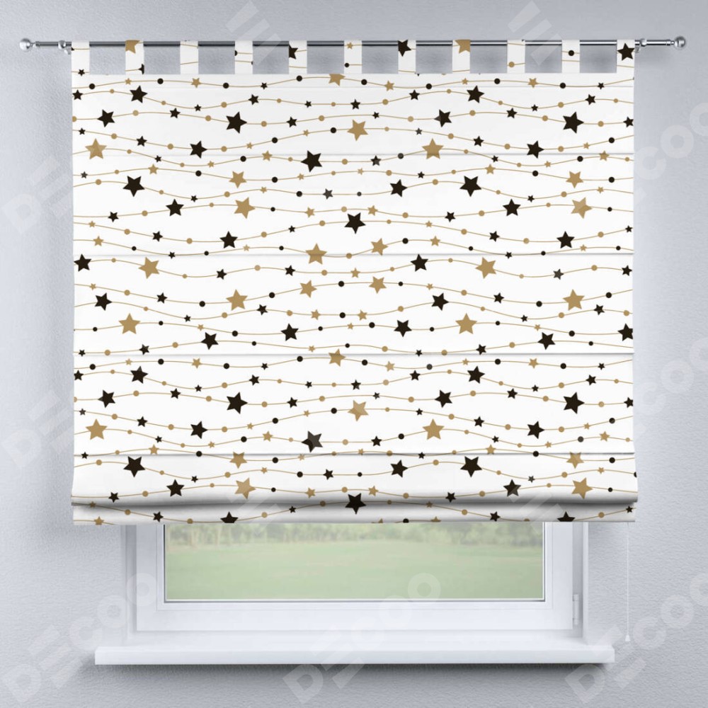 Римская штора производителя «Cortin», используется для проёма, пошита из ткани блэкаут с нанесением сублимационной печати «Звёздная нить». Данная модель пошита на петлях, комплектуется на выбор круглым карнизом и подходит для монтажа на стену. Римская штора на петлях имеет простую систему регулировки высоты, отличительным преимуществом данной модели является простой способ монтажа. Достаточно повесить ее на трубу и штора готова!