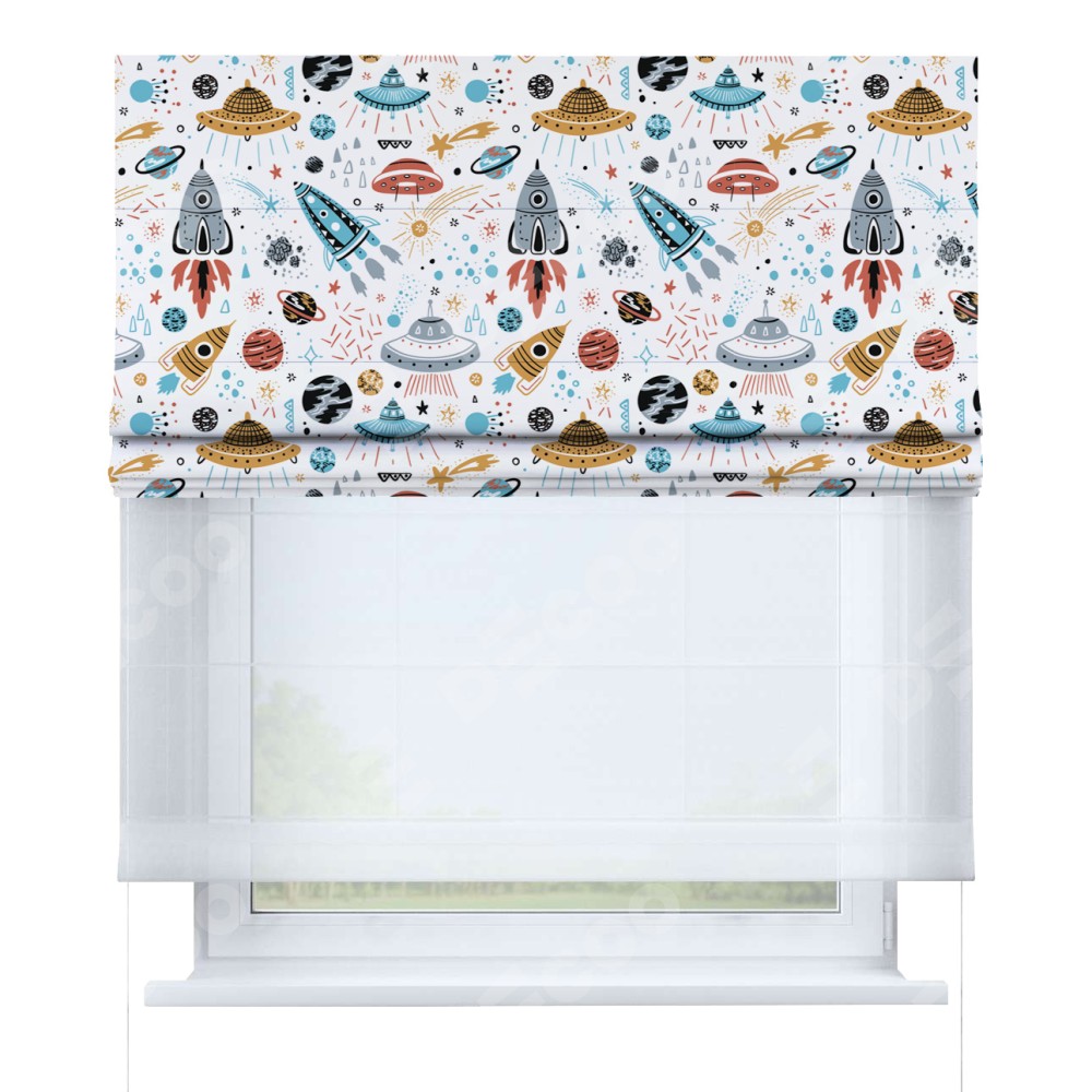 Римская штора день-ночь производителя «Cortin», используется для проёма, пошита из двух полотен, с лицевой блэкаут с нанесением сублимационной печати «Космическое приключение», вторая ткань тюль (по стандарту комплектуется тюль белого цвета артикул V-01). Имеет универсальный механизм и подходит для монтажа: на потолок, на стену и в нишу.