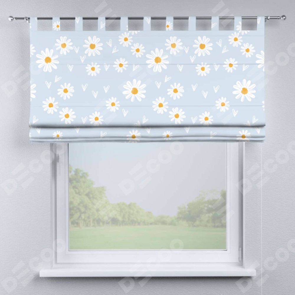 Римская штора производителя «Cortin», используется для проёма, пошита из ткани блэкаут с нанесением сублимационной печати «Летние ромашки». Данная модель пошита на петлях, комплектуется на выбор круглым карнизом и подходит для монтажа на стену. Римская штора на петлях имеет простую систему регулировки высоты, отличительным преимуществом данной модели является простой способ монтажа. Достаточно повесить ее на трубу и штора готова!