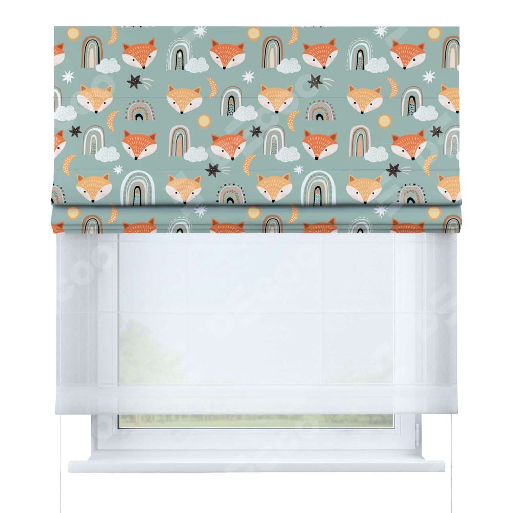 Римская штора день-ночь производителя «Cortin», используется для проёма, пошита из двух полотен, с лицевой блэкаут с нанесением сублимационной печати «Озорные лисички», вторая ткань тюль (по стандарту комплектуется тюль белого цвета артикул V-01). Имеет универсальный механизм и подходит для монтажа: на потолок, на стену и в нишу.