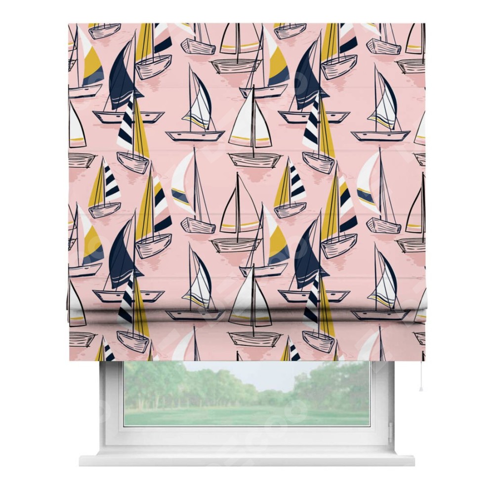 Римская штора производителя «Cortin», используется для проёма, пошита из ткани блэкаут с нанесением сублимационной печати «Парусная регата». Имеет универсальный механизм и подходит для монтажа: на потолок, на стену и в нишу.