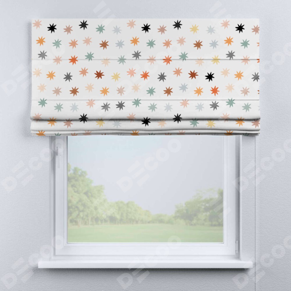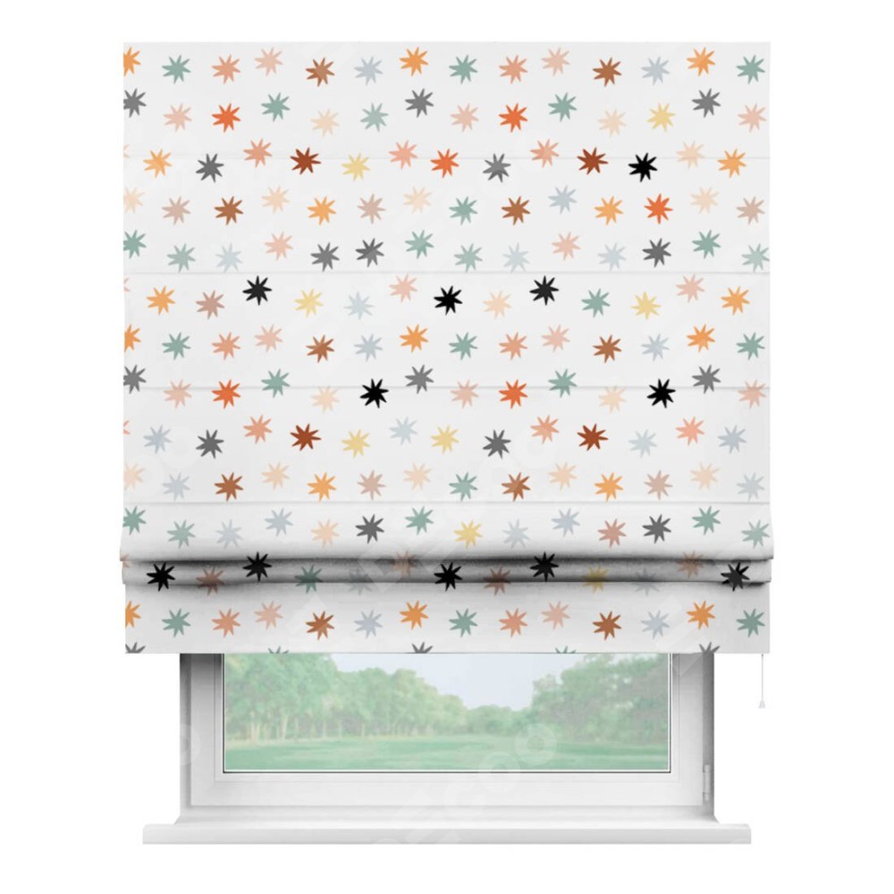 Римская штора производителя «Cortin», используется для проёма, пошита из ткани блэкаут с нанесением сублимационной печати «Разноцветные звёзды». Имеет универсальный механизм и подходит для монтажа: на потолок, на стену и в нишу.