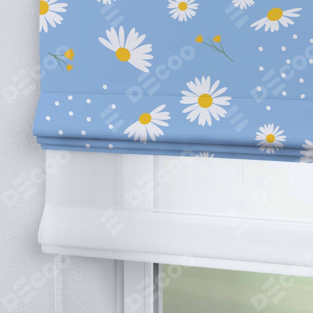 Римская штора день-ночь производителя «Cortin», используется для проёма, пошита из двух полотен, с лицевой блэкаут с нанесением сублимационной печати «Ромашки на голубом», вторая ткань тюль (по стандарту комплектуется тюль белого цвета артикул V-01). Имеет универсальный механизм и подходит для монтажа: на потолок, на стену и в нишу.