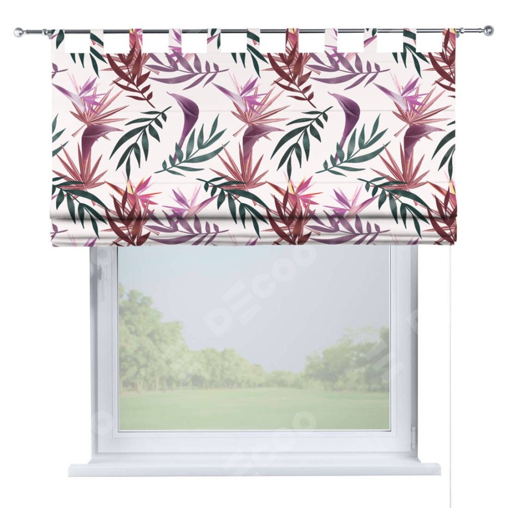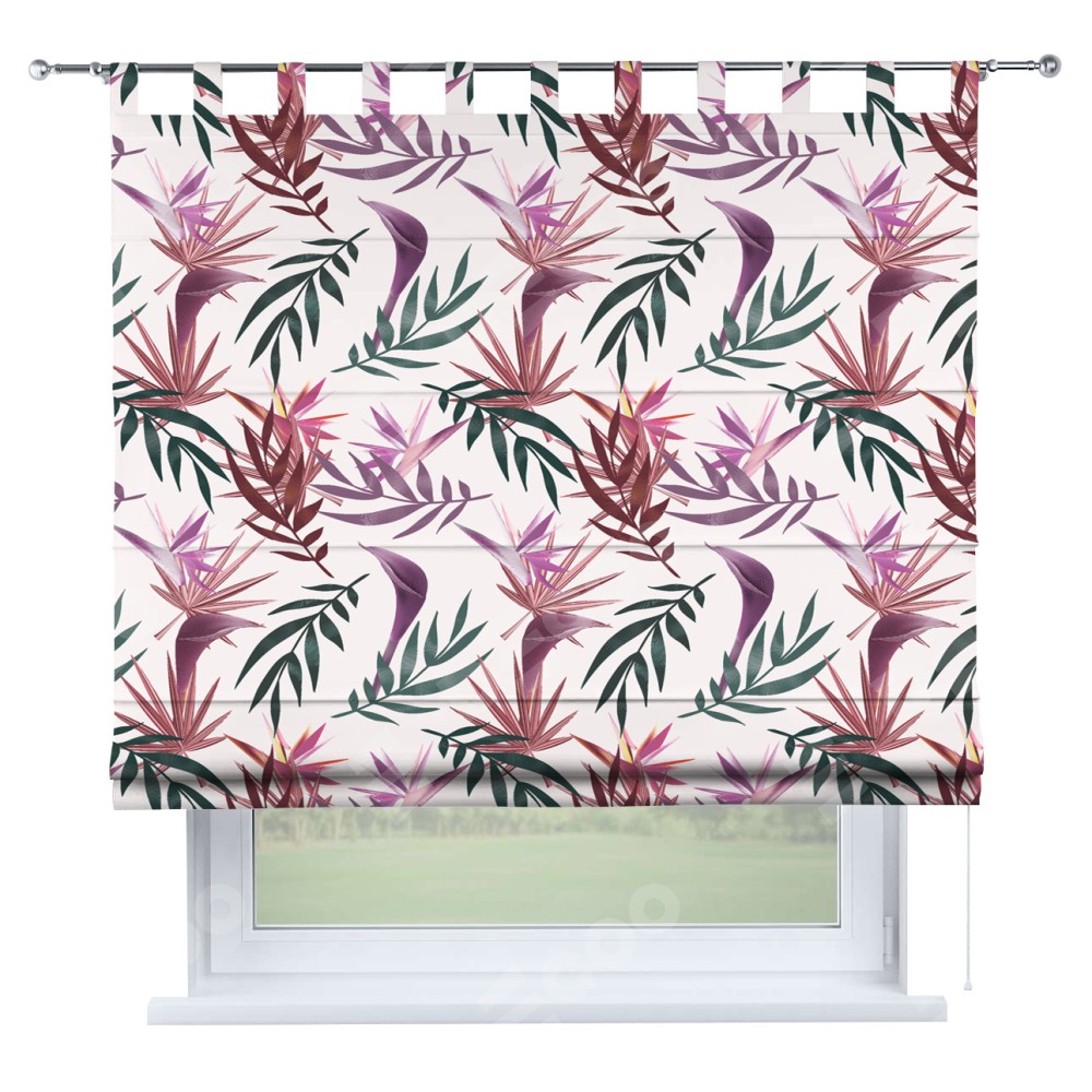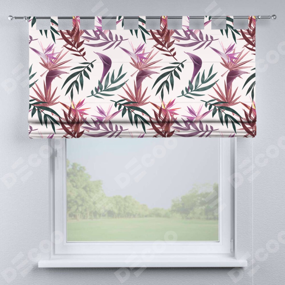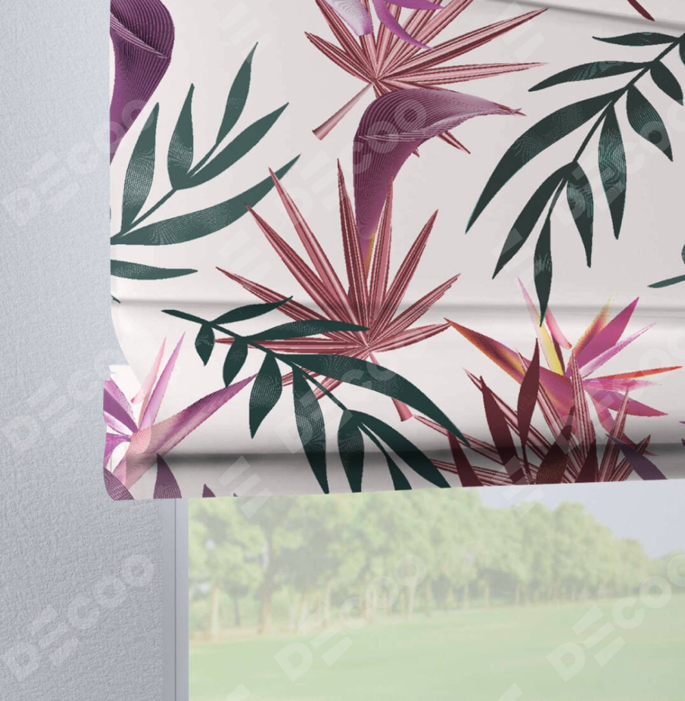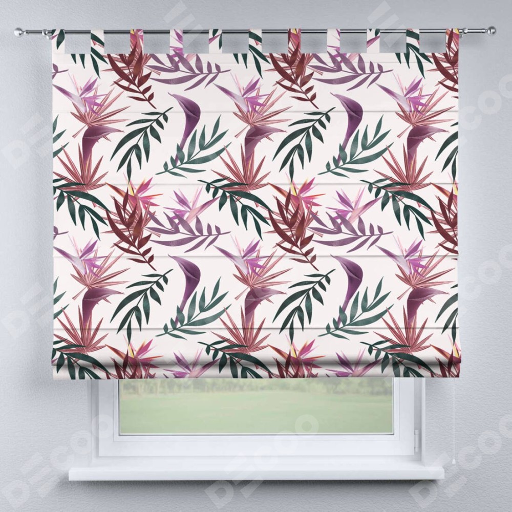 Римская штора производителя «Cortin», используется для проёма, пошита из ткани блэкаут с нанесением сублимационной печати «Тропические побеги». Данная модель пошита на петлях, комплектуется на выбор круглым карнизом и подходит для монтажа на стену. Римская штора на петлях имеет простую систему регулировки высоты, отличительным преимуществом данной модели является простой способ монтажа. Достаточно повесить ее на трубу и штора готова!