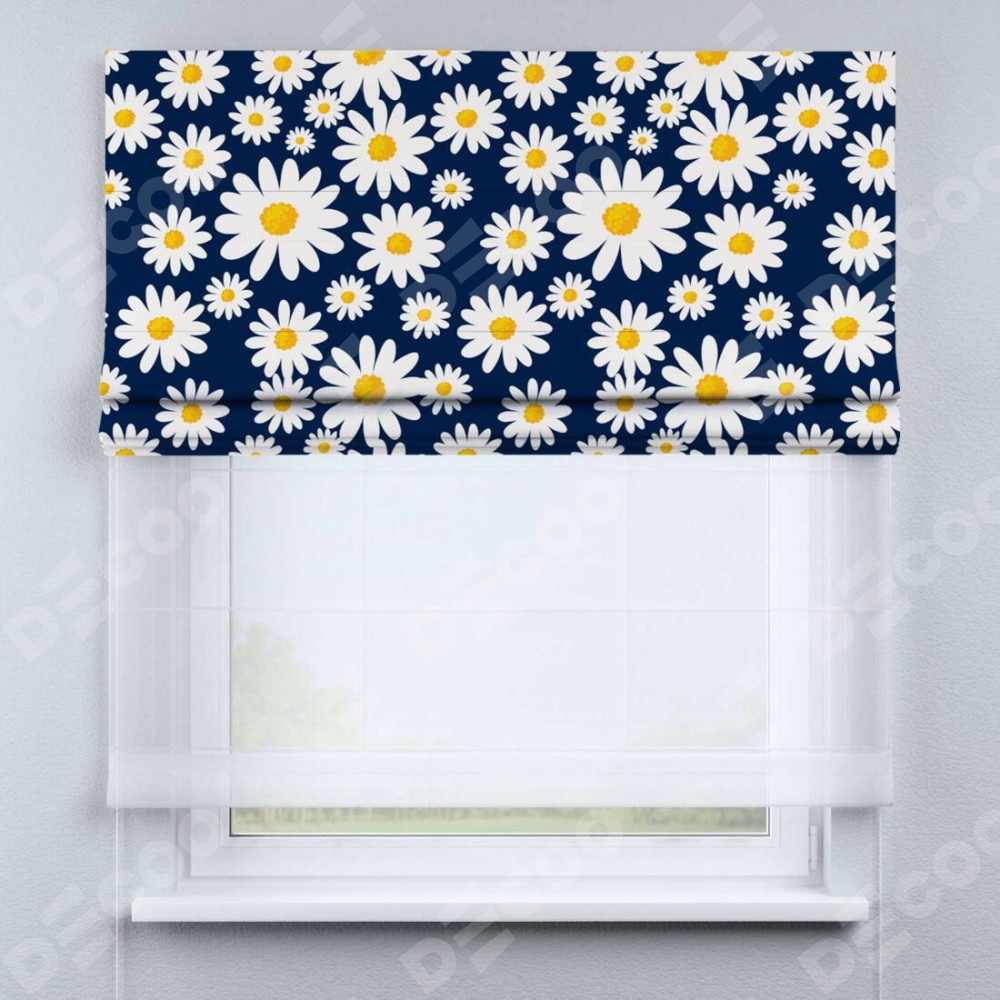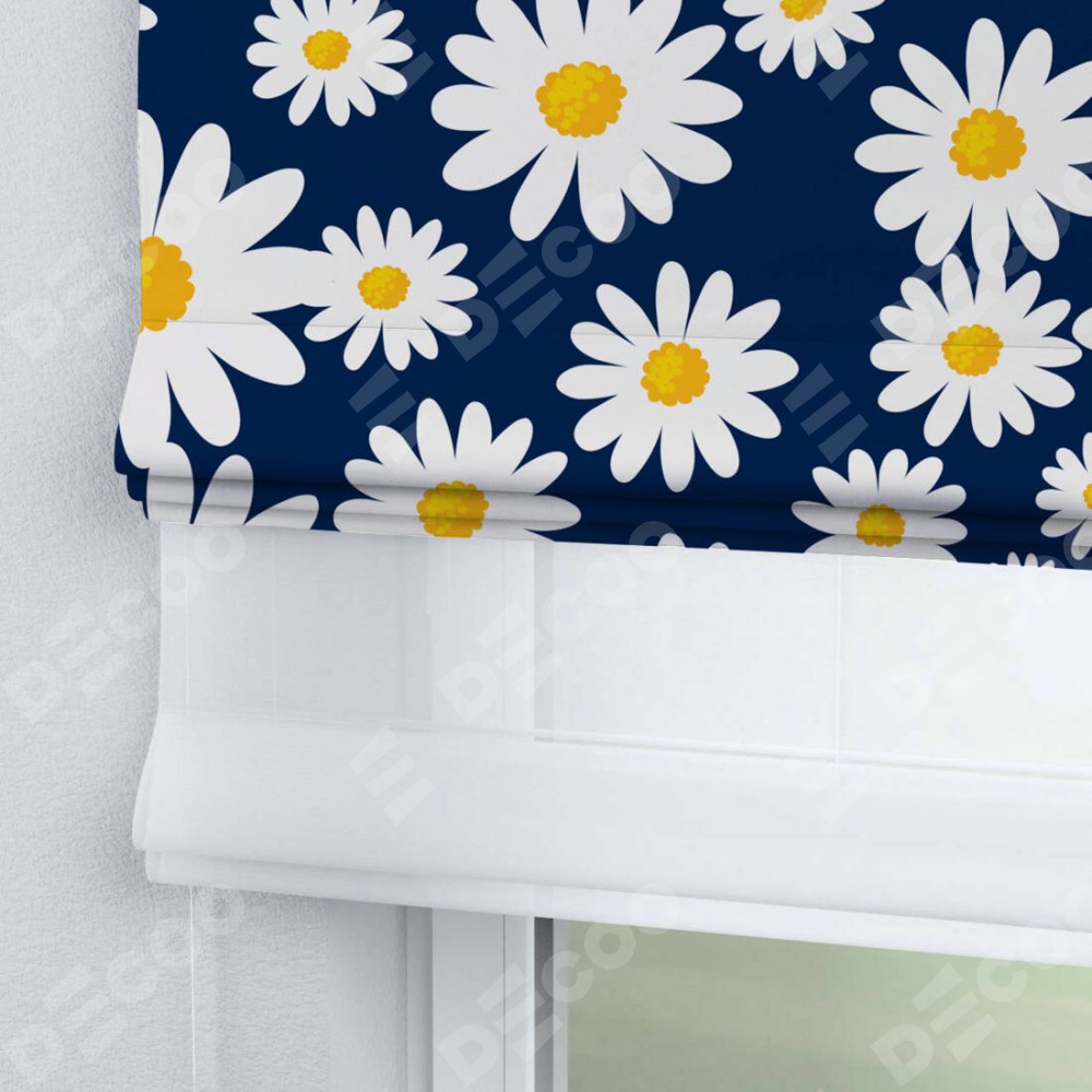 Римская штора день-ночь производителя «Cortin», используется для проёма, пошита из двух полотен, с лицевой блэкаут с нанесением сублимационной печати «Яркие ромашки», вторая ткань тюль (по стандарту комплектуется тюль белого цвета артикул V-01). Имеет универсальный механизм и подходит для монтажа: на потолок, на стену и в нишу.