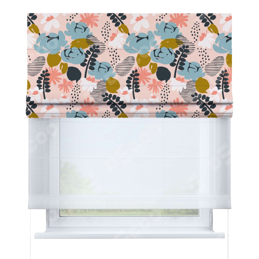 Римская штора день-ночь производителя «Cortin», используется для проёма, пошита из двух полотен, с лицевой блэкаут с нанесением сублимационной печати «Дивные цветы», вторая ткань тюль (по стандарту комплектуется тюль белого цвета артикул V-01). Имеет универсальный механизм и подходит для монтажа: на потолок, на стену и в нишу.