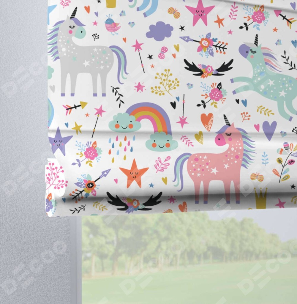 Римская штора производителя «Cortin», используется для проёма, пошита из ткани блэкаут с нанесением сублимационной печати «Радужные единороги». Данная модель пошита на петлях, комплектуется на выбор круглым карнизом и подходит для монтажа на стену. Римская штора на петлях имеет простую систему регулировки высоты, отличительным преимуществом данной модели является простой способ монтажа. Достаточно повесить ее на трубу и штора готова!