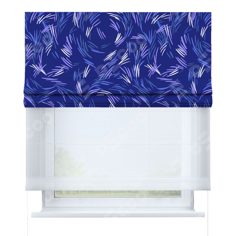 Римская штора день-ночь производителя «Cortin», используется для проёма, пошита из двух полотен, с лицевой блэкаут с нанесением сублимационной печати «Синяя абстракция», вторая ткань тюль (по стандарту комплектуется тюль белого цвета артикул V-01). Имеет универсальный механизм и подходит для монтажа: на потолок, на стену и в нишу.