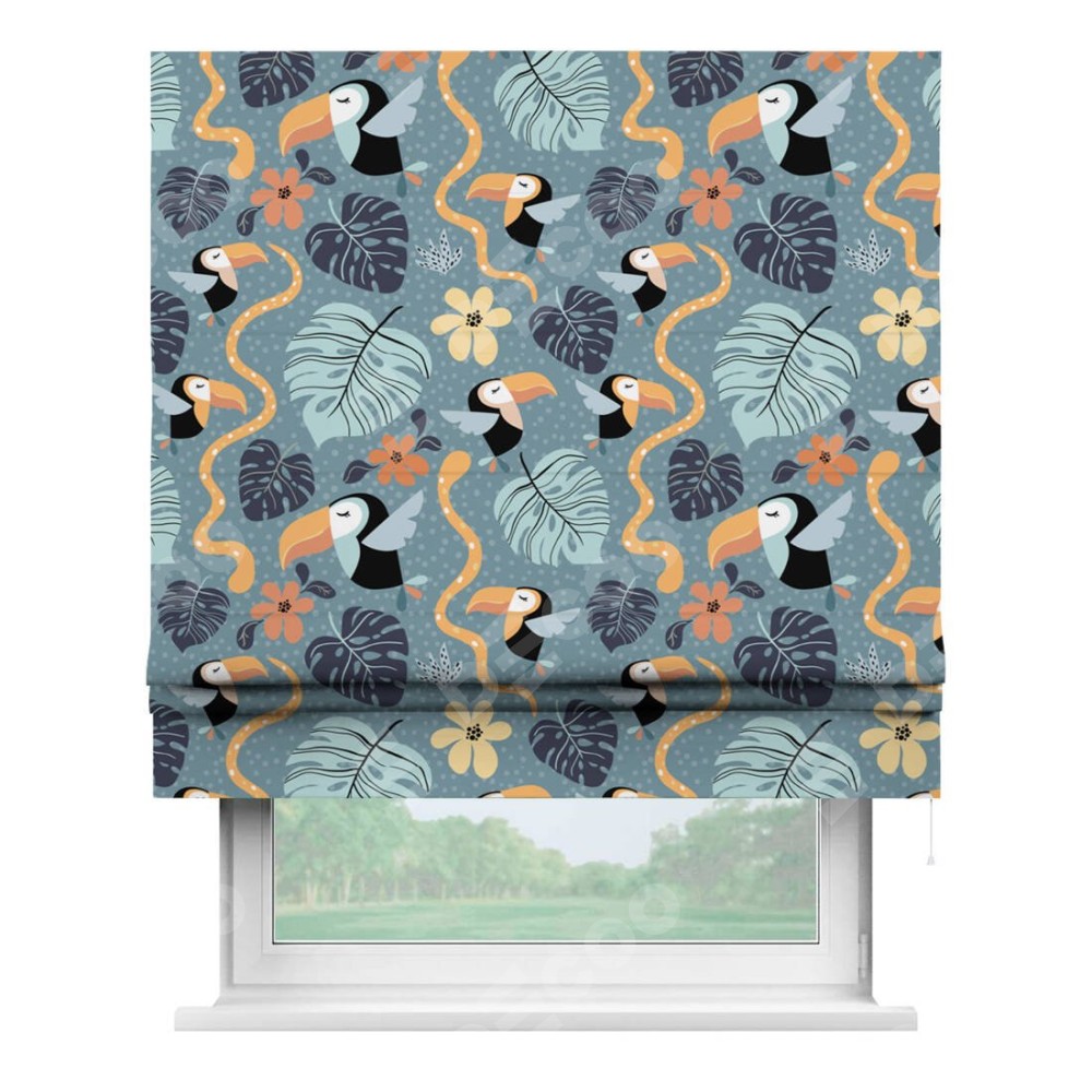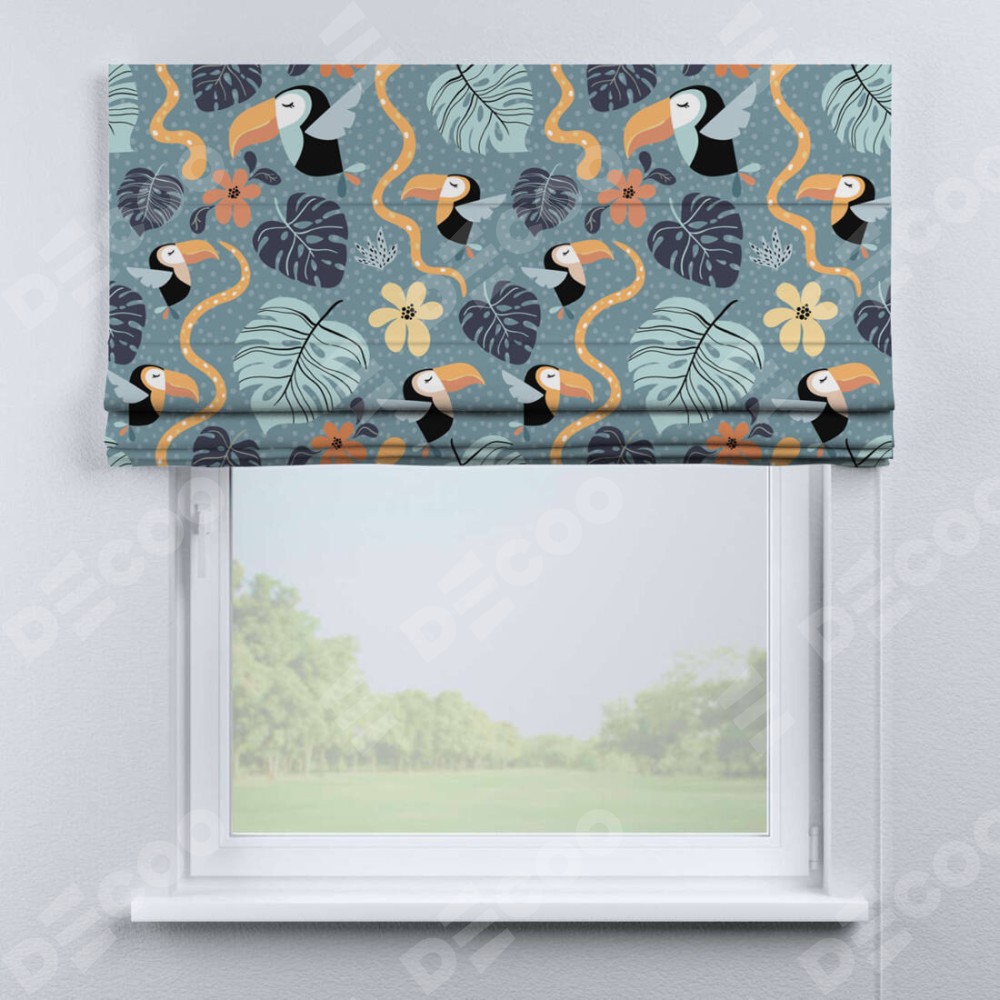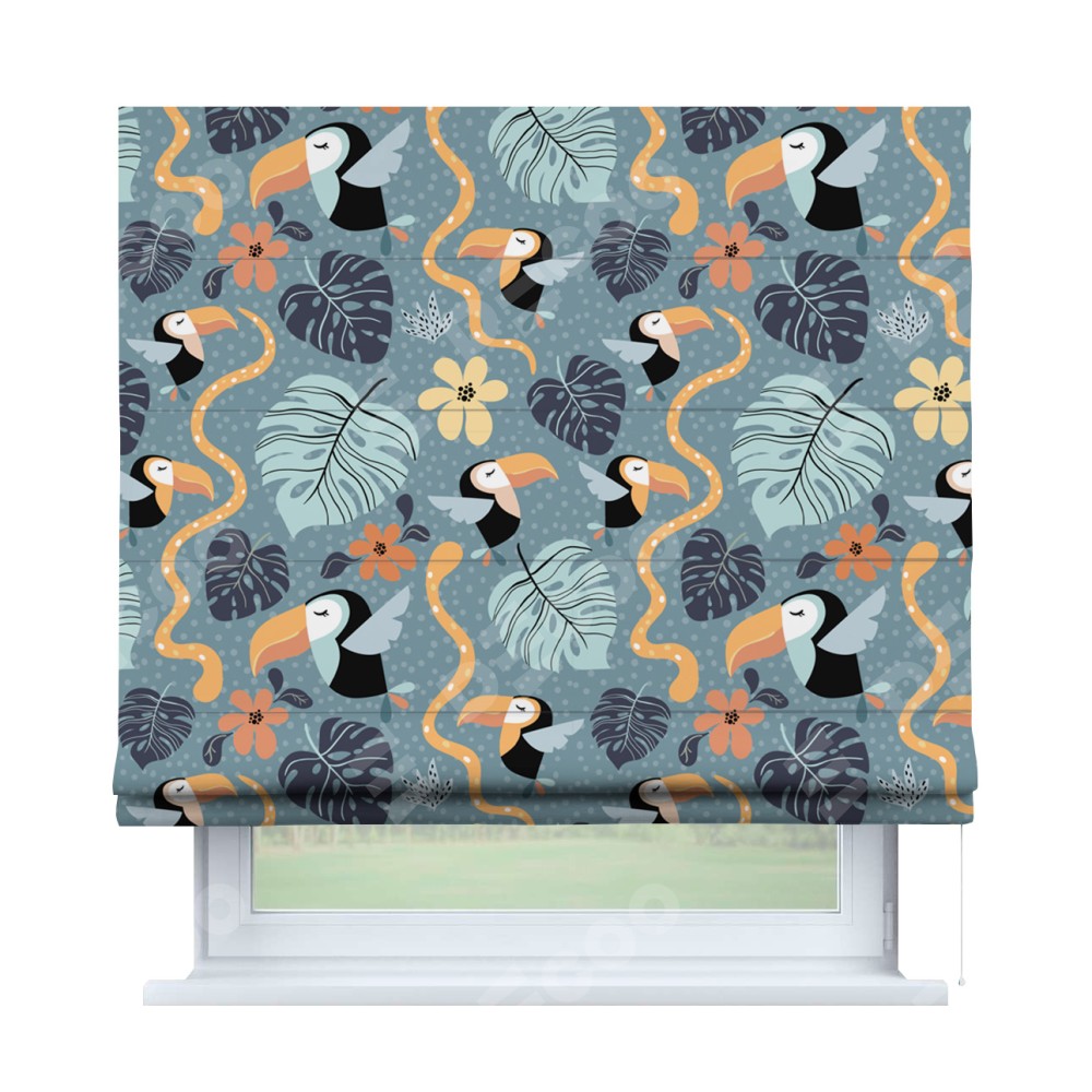 Римская штора производителя «Cortin», используется для проёма, пошита из ткани блэкаут с нанесением сублимационной печати «Экзотические птицы». Имеет универсальный механизм и подходит для монтажа: на потолок, на стену и в нишу.