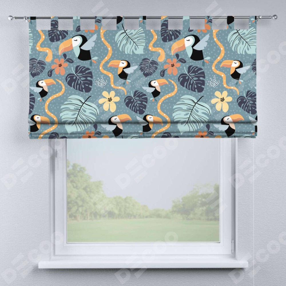 Римская штора производителя «Cortin», используется для проёма, пошита из ткани блэкаут с нанесением сублимационной печати «Экзотические птицы». Данная модель пошита на петлях, комплектуется на выбор круглым карнизом и подходит для монтажа на стену. Римская штора на петлях имеет простую систему регулировки высоты, отличительным преимуществом данной модели является простой способ монтажа. Достаточно повесить ее на трубу и штора готова!