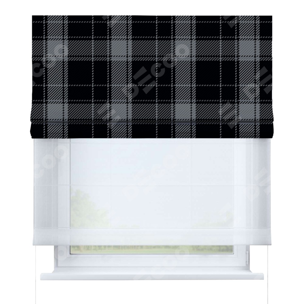 Римская штора день-ночь производителя «Cortin», используется для проёма, пошита из двух полотен, с лицевой блэкаут с нанесением сублимационной печати «Стильная клетка», вторая ткань тюль (по стандарту комплектуется тюль белого цвета артикул V-01). Имеет универсальный механизм и подходит для монтажа: на потолок, на стену и в нишу.