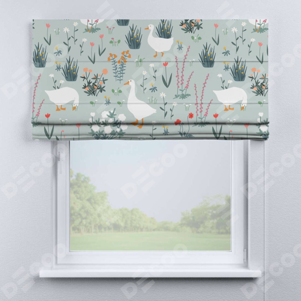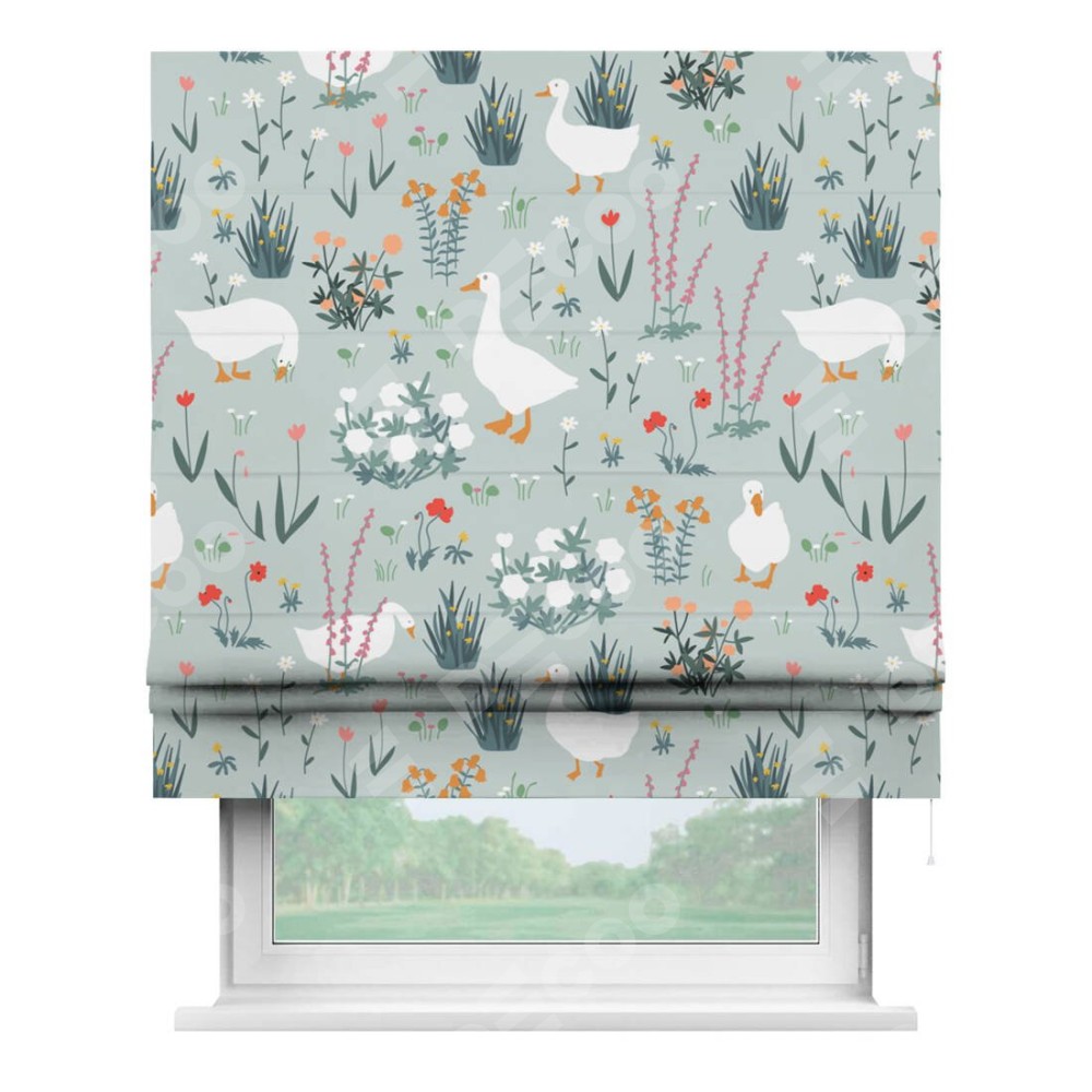 Римская штора производителя «Cortin», используется для проёма, пошита из ткани блэкаут с нанесением сублимационной печати «Гуси на лугу». Имеет универсальный механизм и подходит для монтажа: на потолок, на стену и в нишу.