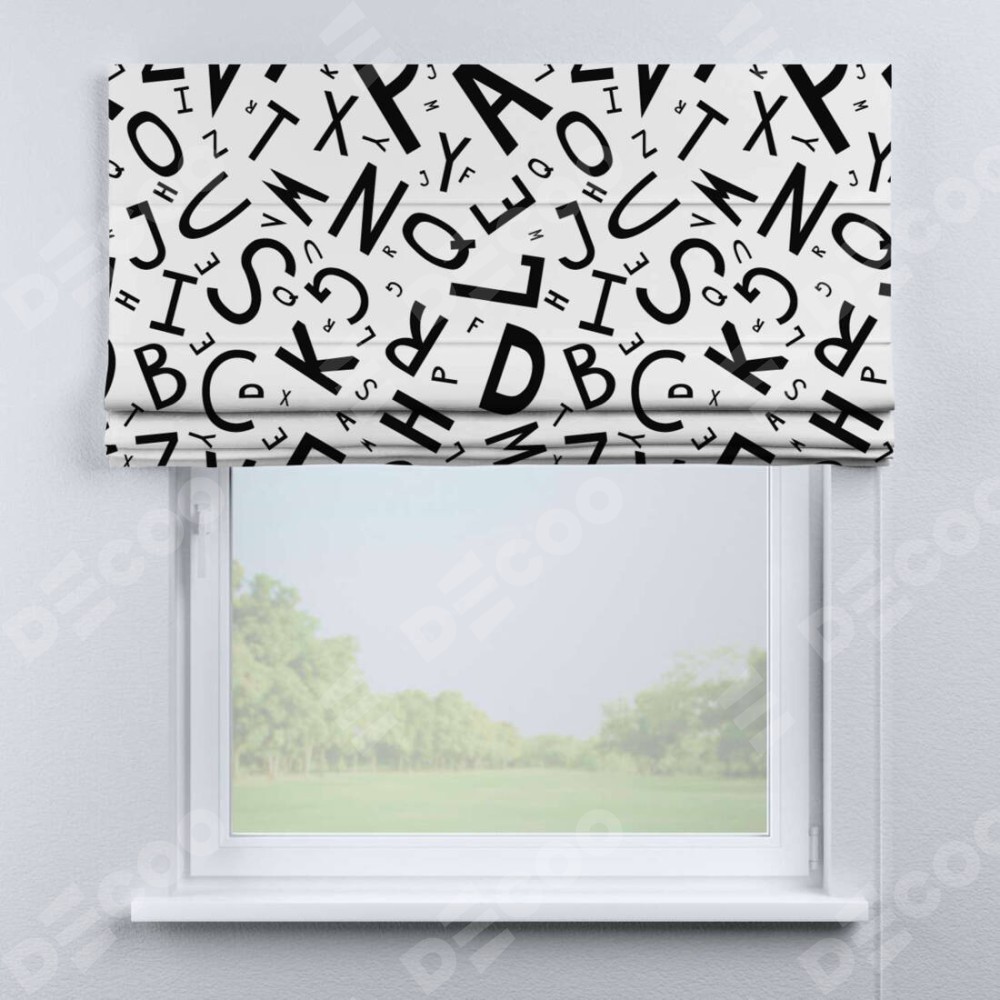 Римская штора производителя «Cortin», используется для проёма, пошита из ткани блэкаут с нанесением сублимационной печати «Литеры на белом». Имеет универсальный механизм и подходит для монтажа: на потолок, на стену и в нишу.