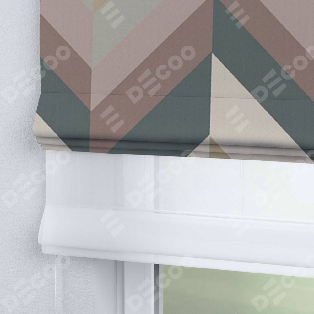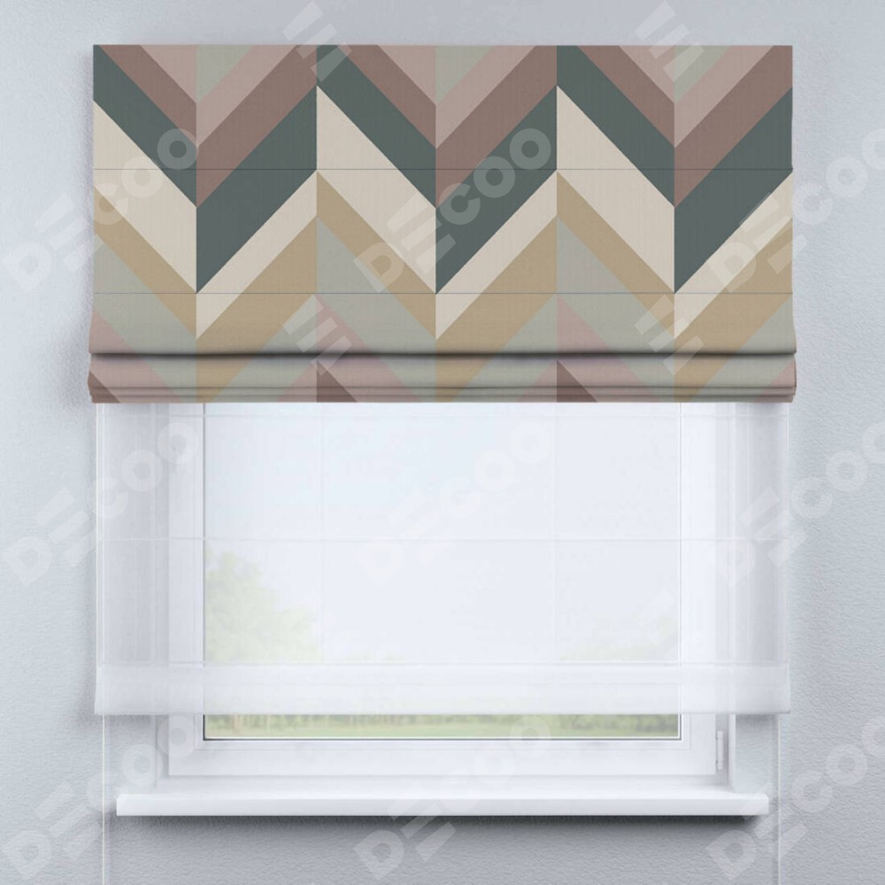 Римская штора день-ночь производителя «Cortin», используется для проёма, пошита из двух полотен, с лицевой блэкаут с нанесением сублимационной печати «Шеврон Авеню», вторая ткань тюль (по стандарту комплектуется тюль белого цвета артикул V-01). Имеет универсальный механизм и подходит для монтажа: на потолок, на стену и в нишу.