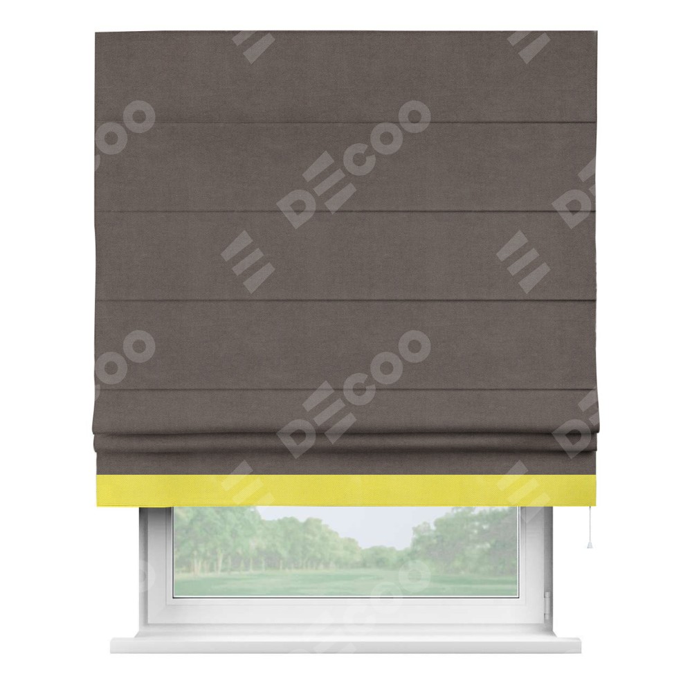 Римская штора производителя «Cortin», используется для проёма, пошита из ткани вельвет коричневый, артикул ткани 14135. Отделка шторы кантом «Джестер», ткань для канта используется из вельвета разной расцветки на выбор. Имеет универсальный механизм и подходит для монтажа: на потолок, на стену и в нишу.