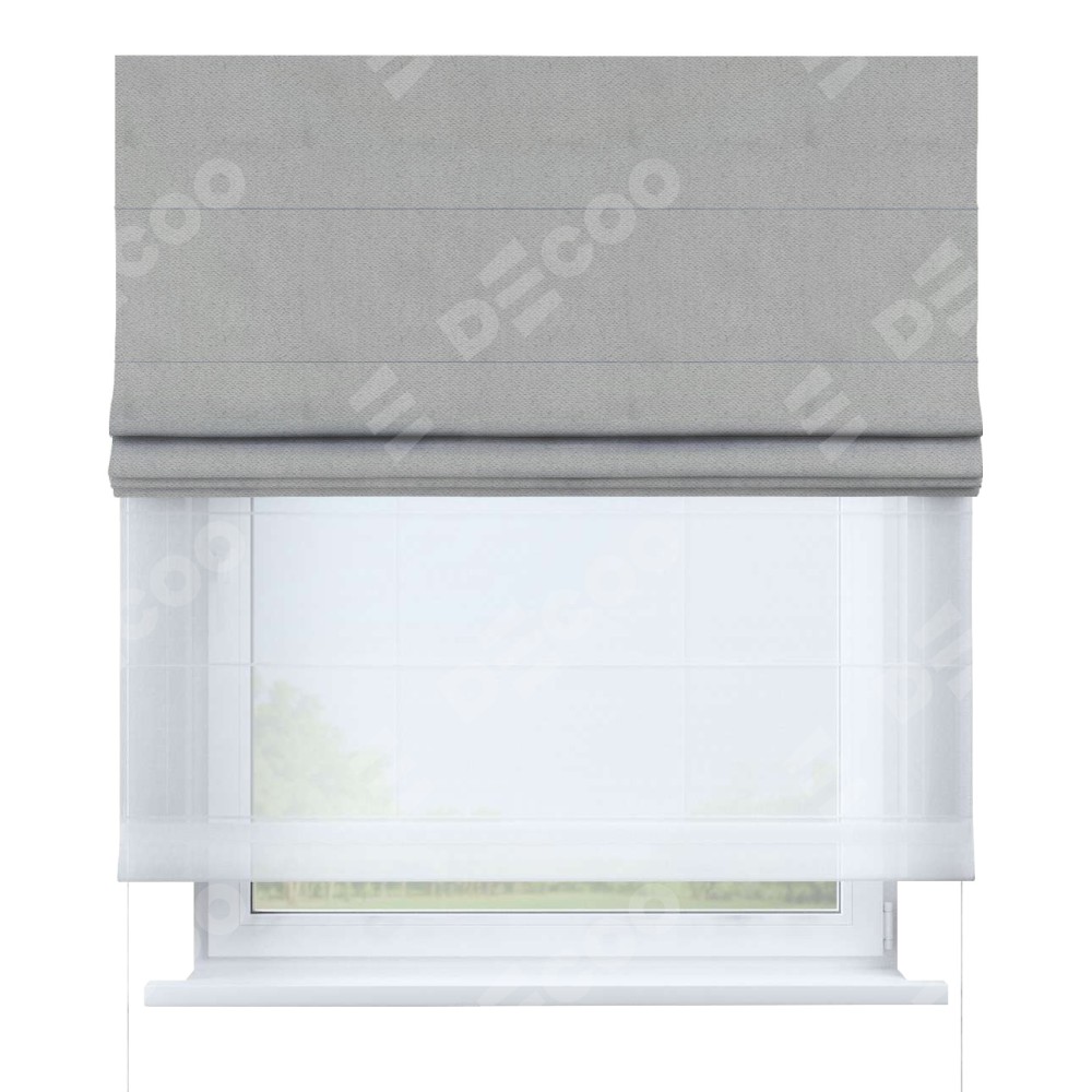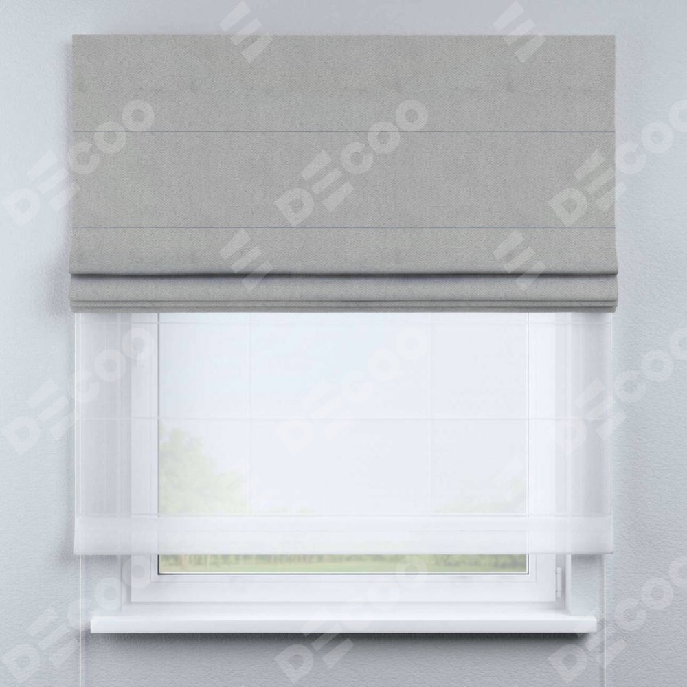 Римская штора день-ночь производителя «Cortin», используется для проёма, пошита из двух полотен, с лицевой стороны блэкаут с блеском тёмно-серый артикул 34634, вторая ткань тюль (по стандарту комплектуется тюль белого цвета артикул V-01). Изнаночная сторона основного материала черного цвета, что обеспечивает необходимую светонепроницаемость. Имеет универсальный механизм и подходит для монтажа: на потолок, на стену и в нишу.