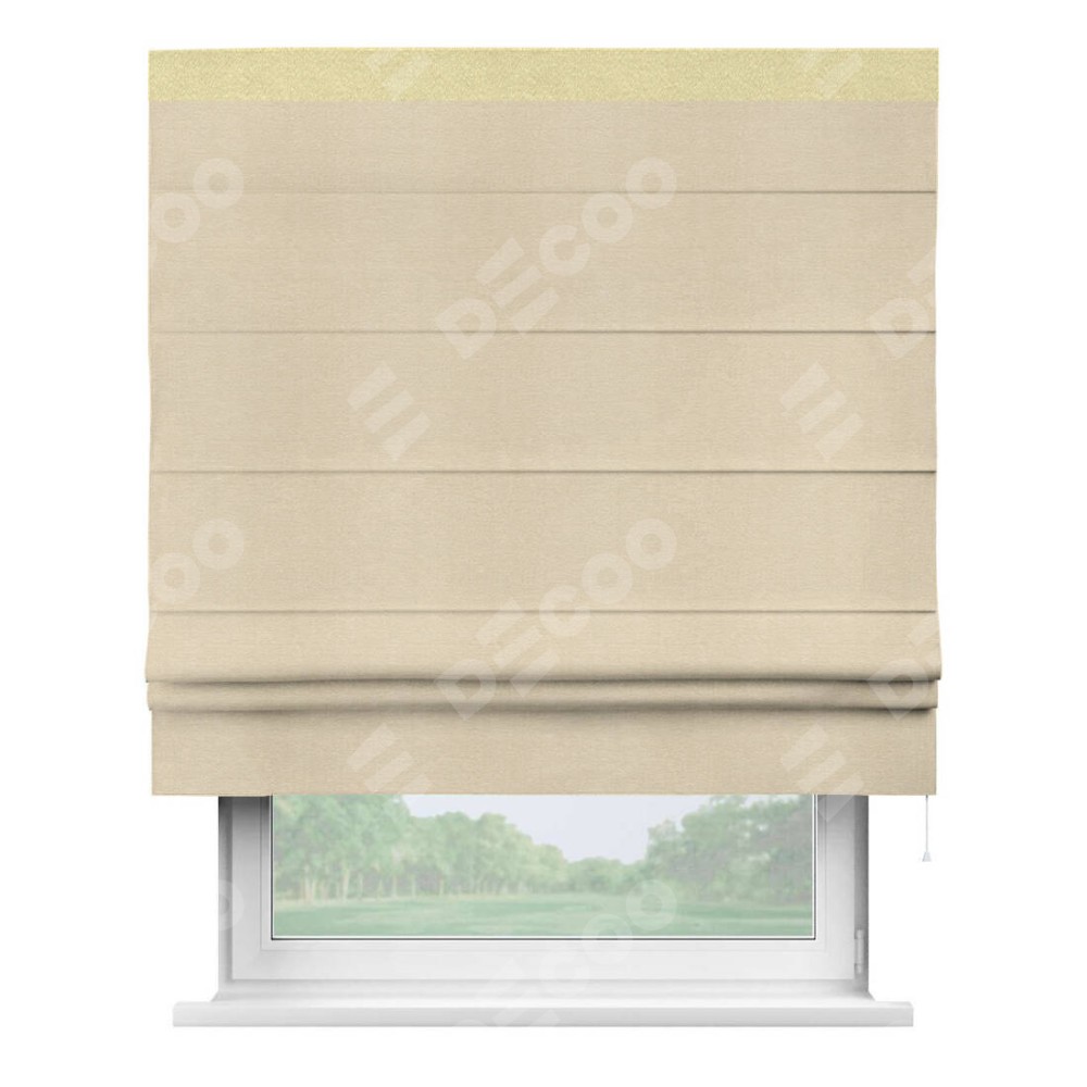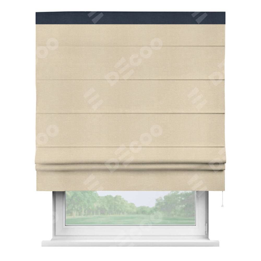 Римская штора производителя «Cortin», используется для проёма, пошита из ткани софт однотонный бежевый лайт, артикул 33100. Отделка шторы кантом «Кинг», ткань для канта используется из софта разной расцветки на выбор. Имеет универсальный механизм и подходит для монтажа: на потолок, на стену и в нишу.