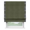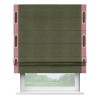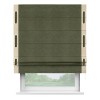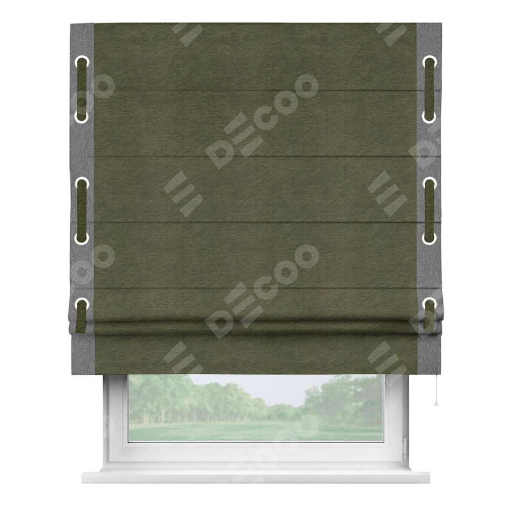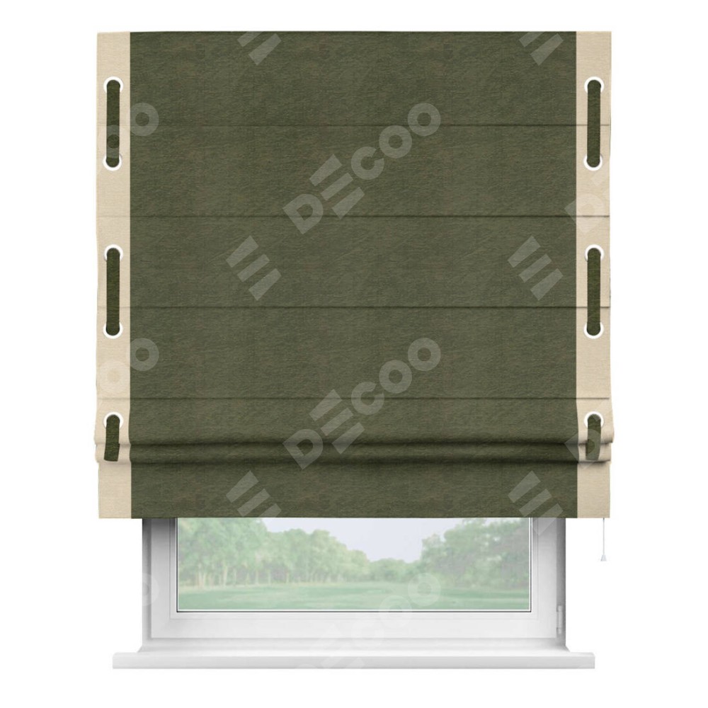 Римская штора производителя «Cortin», используется для проёма, пошита из ткани софт однотонный зелёный, артикул 33110. Отделка шторы кантом «Стрим Дуо» на кантах расположены люверсы с пояском, ткань для канта используется из софта разной расцветки на выбор. Ткань для пояска обычно используется из основной ткани шторы, а так же можно сделать из любой расцветки по желанию. Имеет универсальный механизм и подходит для монтажа: на потолок, на стену и в нишу.