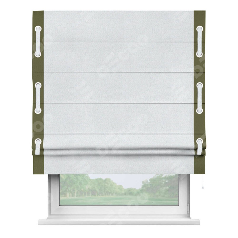Римская штора производителя «Cortin», используется для проёма, пошита из ткани блэкаут однотонный дымчато-белый, артикул ткани 101. Отделка шторы кантом «Стрим Дуо» на кантах расположены люверсы с пояском, ткань для канта используется из блэкаута однотонного разной расцветки на выбор. Ткань для пояска обычно используется из основной ткани шторы, а так же можно сделать из любой расцветки по желанию. Имеет универсальный механизм и подходит для монтажа: на потолок, на стену и в нишу.