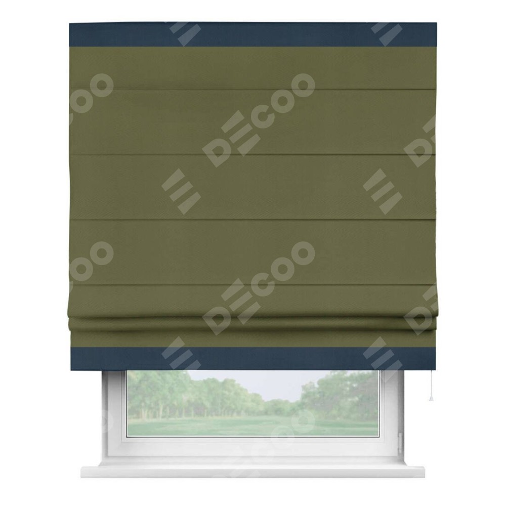 Римская штора производителя «Cortin», используется для проёма, пошита из ткани блэкаут однотонный зелёный, артикул ткани 81859. Отделка шторы кантом «Горизонт», ткань для канта используется из блэкаута однотонного разной расцветки на выбор. Имеет универсальный механизм и подходит для монтажа: на потолок, на стену и в нишу.