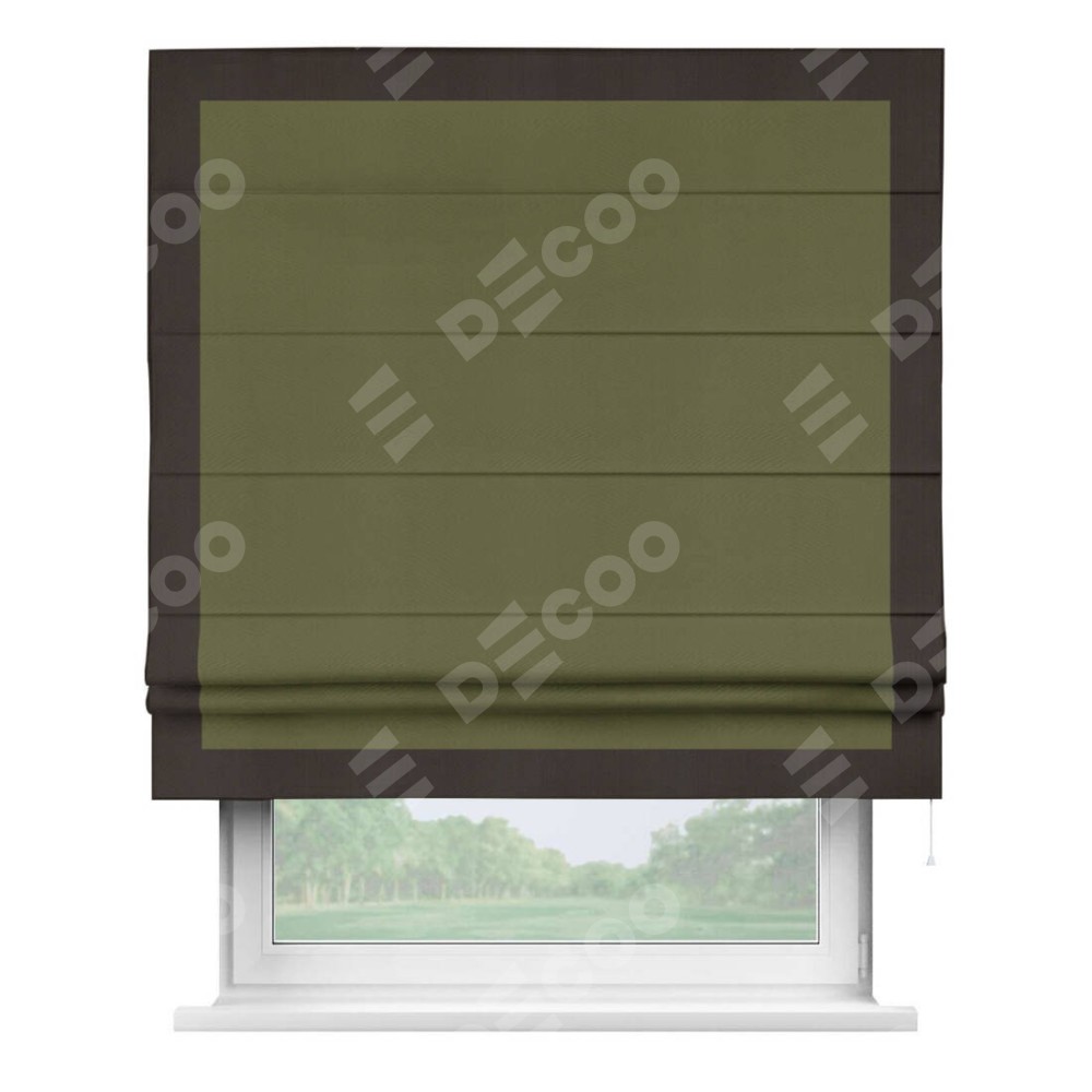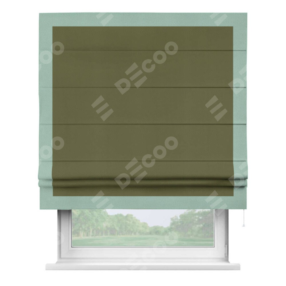 Римская штора производителя «Cortin», используется для проёма, пошита из ткани блэкаут однотонный зелёный, артикул ткани 81859. Отделка шторы кантом «Чесс», ткань для канта используется из блэкаута однотонного разной расцветки на выбор. Имеет универсальный механизм и подходит для монтажа: на потолок, на стену и в нишу.