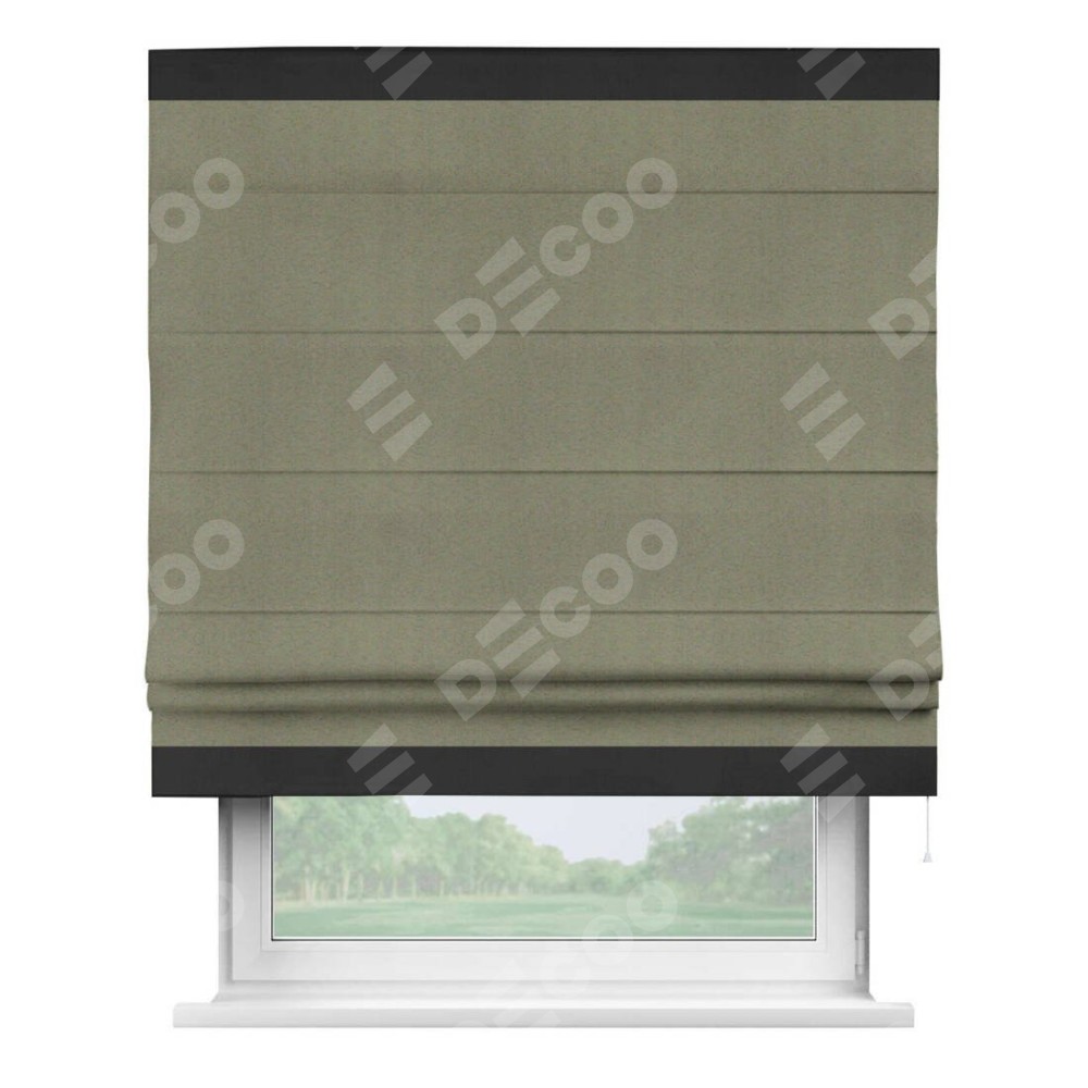 Римская штора производителя «Cortin», используется для проёма, пошита из ткани блэкаут однотонный серо-коричневый, артикул ткани 29568. Отделка шторы кантом «Горизонт», ткань для канта используется из блэкаута однотонного разной расцветки на выбор. Имеет универсальный механизм и подходит для монтажа: на потолок, на стену и в нишу.
