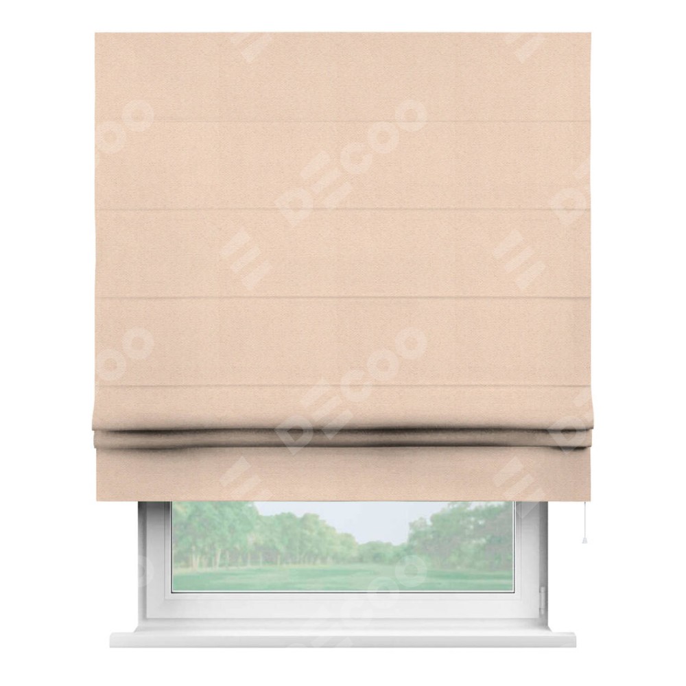 Римская штора производителя «Cortin», используется для проёма, пошита из ткани блэкаут тиснение с блеском розовая пудра, артикул ткани 34632. Изнаночная сторона материала черного цвета, что обеспечивает необходимую светонепроницаемость. Имеет универсальный механизм и подходит для монтажа: на потолок, на стену и в нишу.