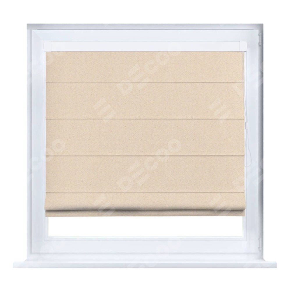 Римская штора производителя «Cortin», устанавливается на створку окна, пошита из ткани блэкаут тиснение с блеском бежевый, артикул 34627. Изнаночная сторона материала черного цвета, что обеспечивает необходимую светонепроницаемость. Штора шьётся по индивидуальным размерам, для данного типа римской шторы возможная ширина от 35 до 150 см., высота до 250 см.