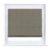 Римская штора кассетного типа, производителя «Cortin», устанавливается только на пластиковые окна и прилегает к стеклопакету, пошита из ткани из ткани блэкаут тиснение с блеском графитовый, артикул 34648. Изнаночная сторона материала черного цвета, что обеспечивает необходимую светонепроницаемость.