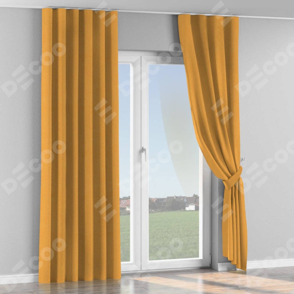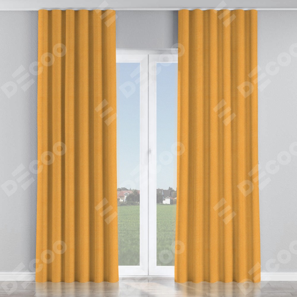 Комплект прямых штор, от производителя «Cortin», пошиты из ткани блэкаут с блеском золотой, артикул ткани 34626. С изнаночной стороны в верхней части штор пристрачивается шторная лента с декоративными складками «Волна». Обратная сторона основного материала черного цвета, что обеспечивает необходимую светонепроницаемость. Для создания элегантных складок прямые шторы шьются по стандарту с коэффициентом 1:2 (на 100 см. ширины проёма 200 см. ширины ткани).