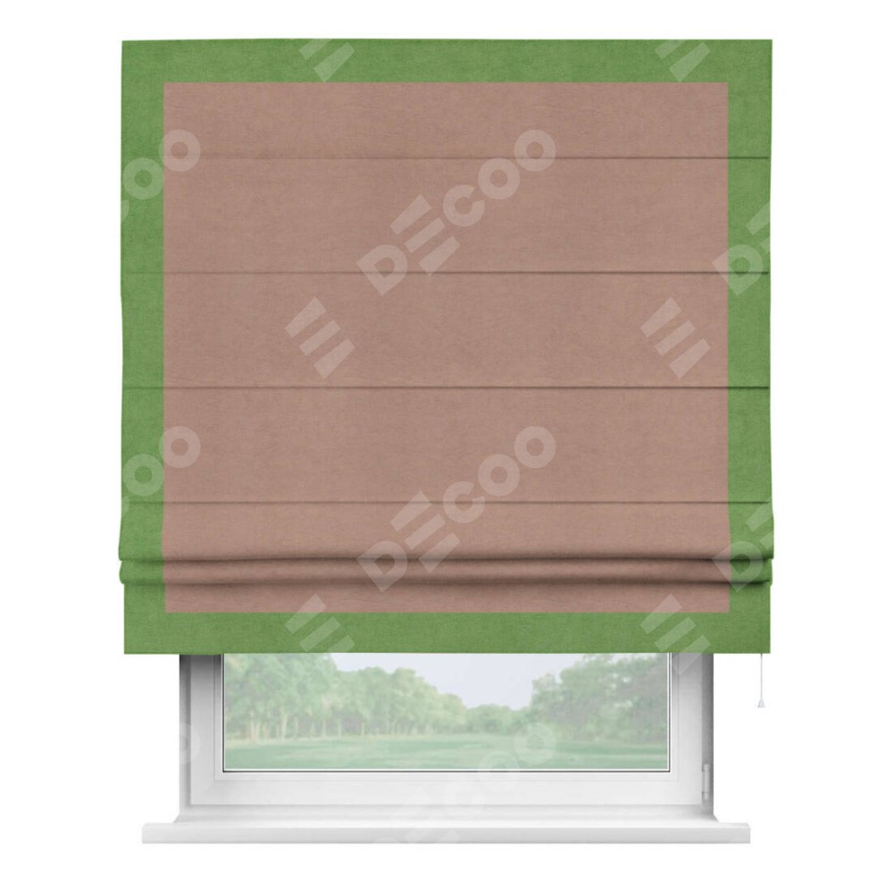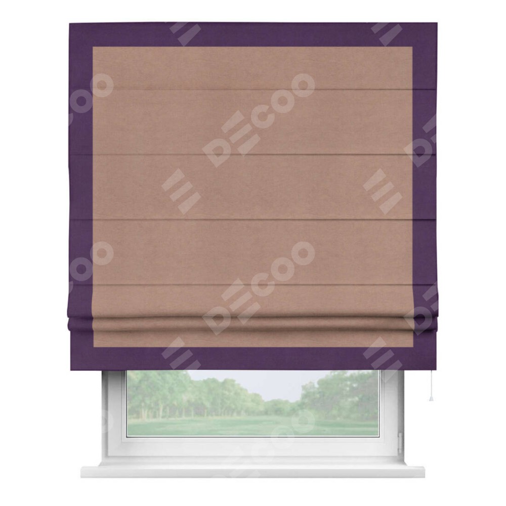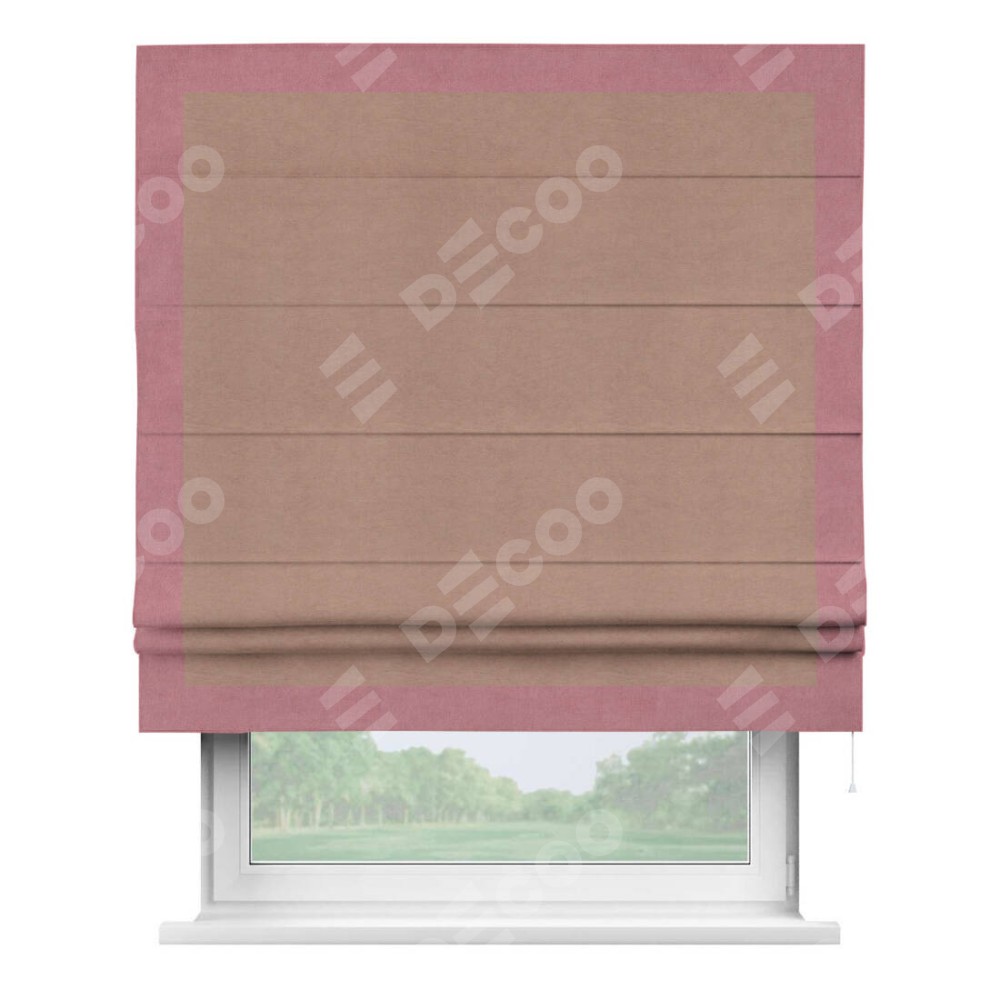 Римская штора производителя «Cortin», используется для проёма, пошита из ткани вельвет брусничный джем, артикул ткани 17750. Отделка шторы кантом «Чесс», ткань для канта используется из вельвета разной расцветки на выбор. Имеет универсальный механизм и подходит для монтажа: на потолок, на стену и в нишу.
