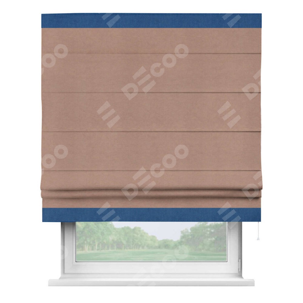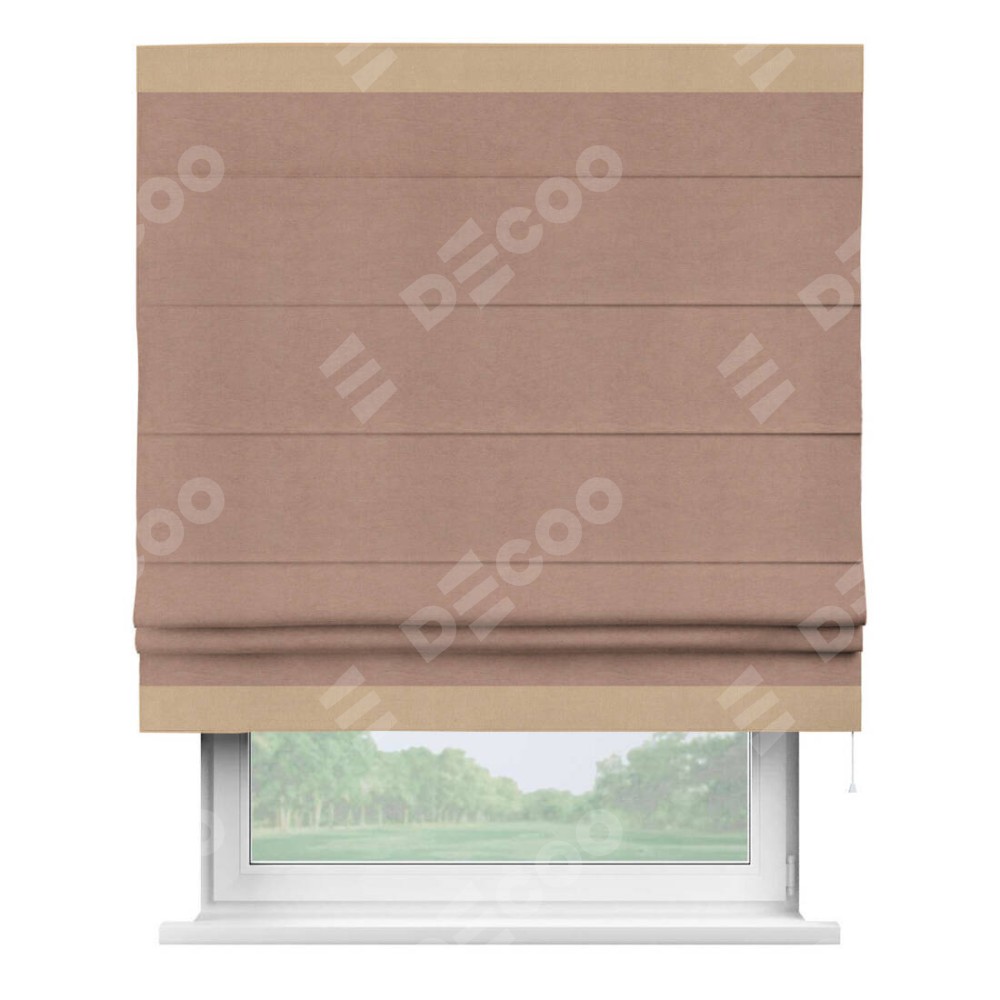 Римская штора производителя «Cortin», используется для проёма, пошита из ткани вельвет брусничный джем, артикул ткани 17750. Отделка шторы кантом «Горизонт», ткань для канта используется из вельвета разной расцветки на выбор. Имеет универсальный механизм и подходит для монтажа: на потолок, на стену и в нишу.