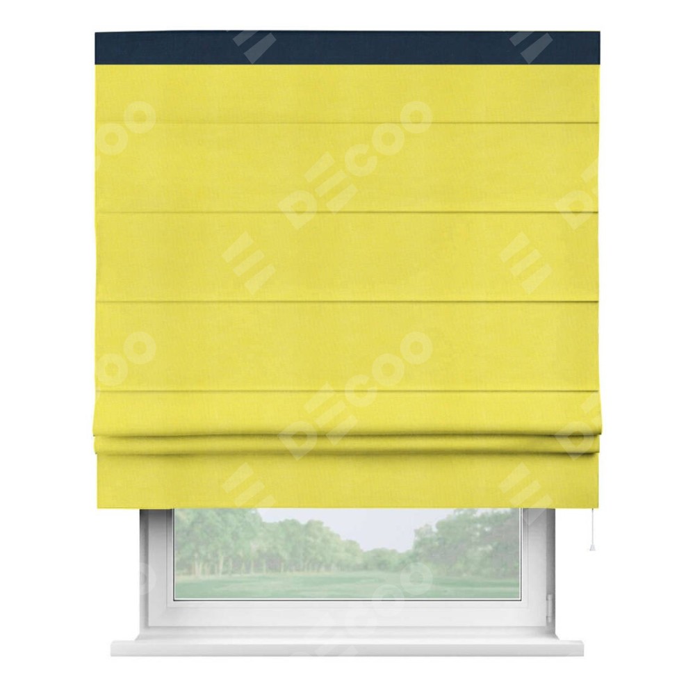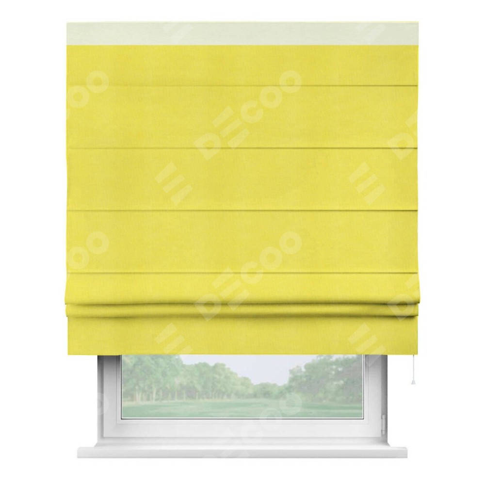 Римская штора производителя «Cortin», используется для проёма, пошита из ткани вельвет cветло-желтый, артикул ткани 30997. Отделка шторы кантом «Кинг», ткань для канта используется из вельвета разной расцветки на выбор. Имеет универсальный механизм и подходит для монтажа: на потолок, на стену и в нишу.