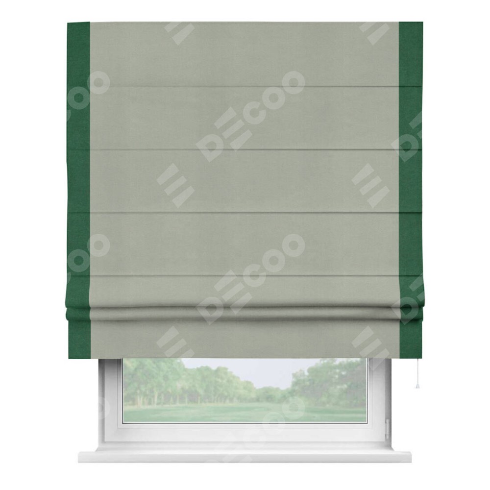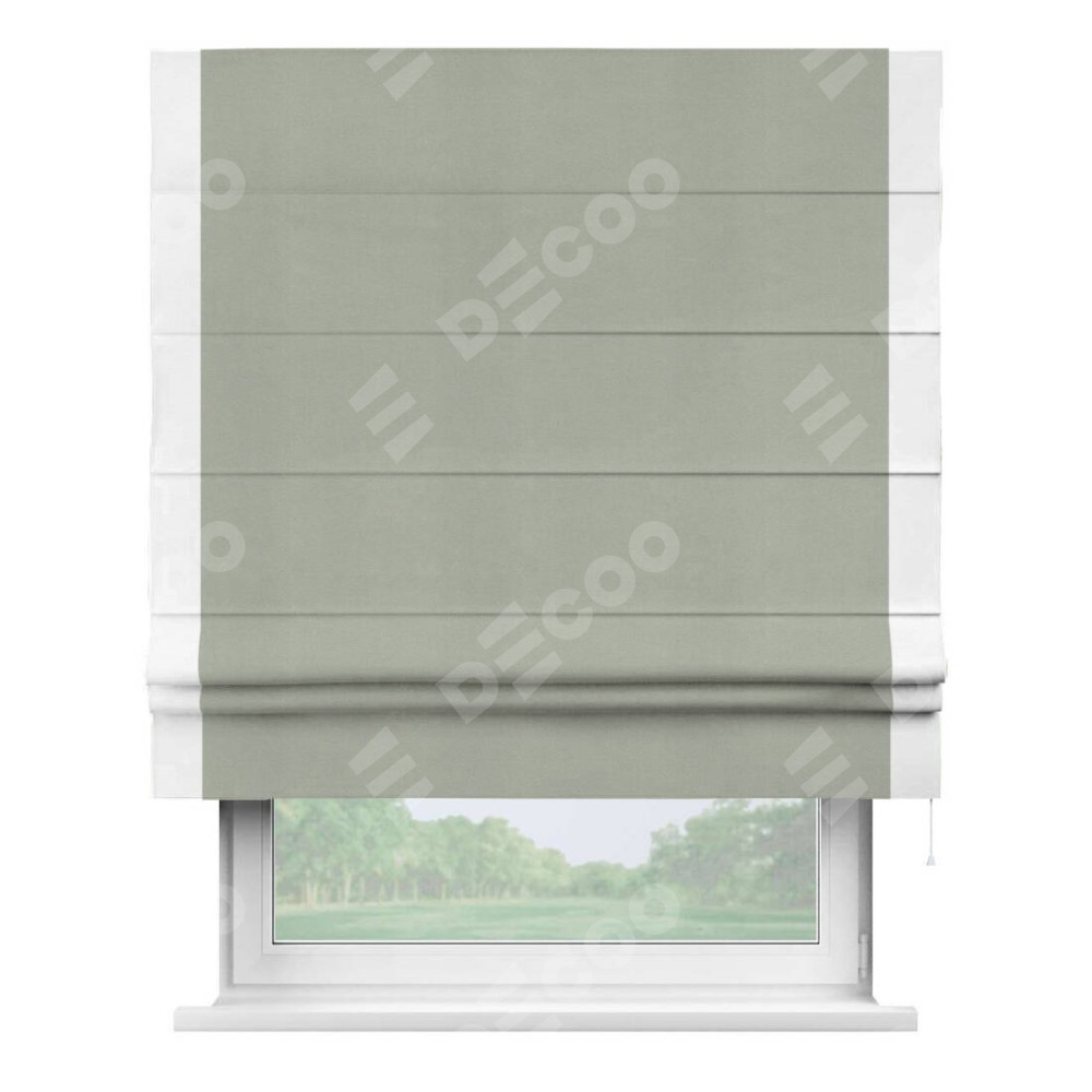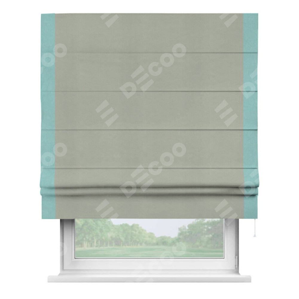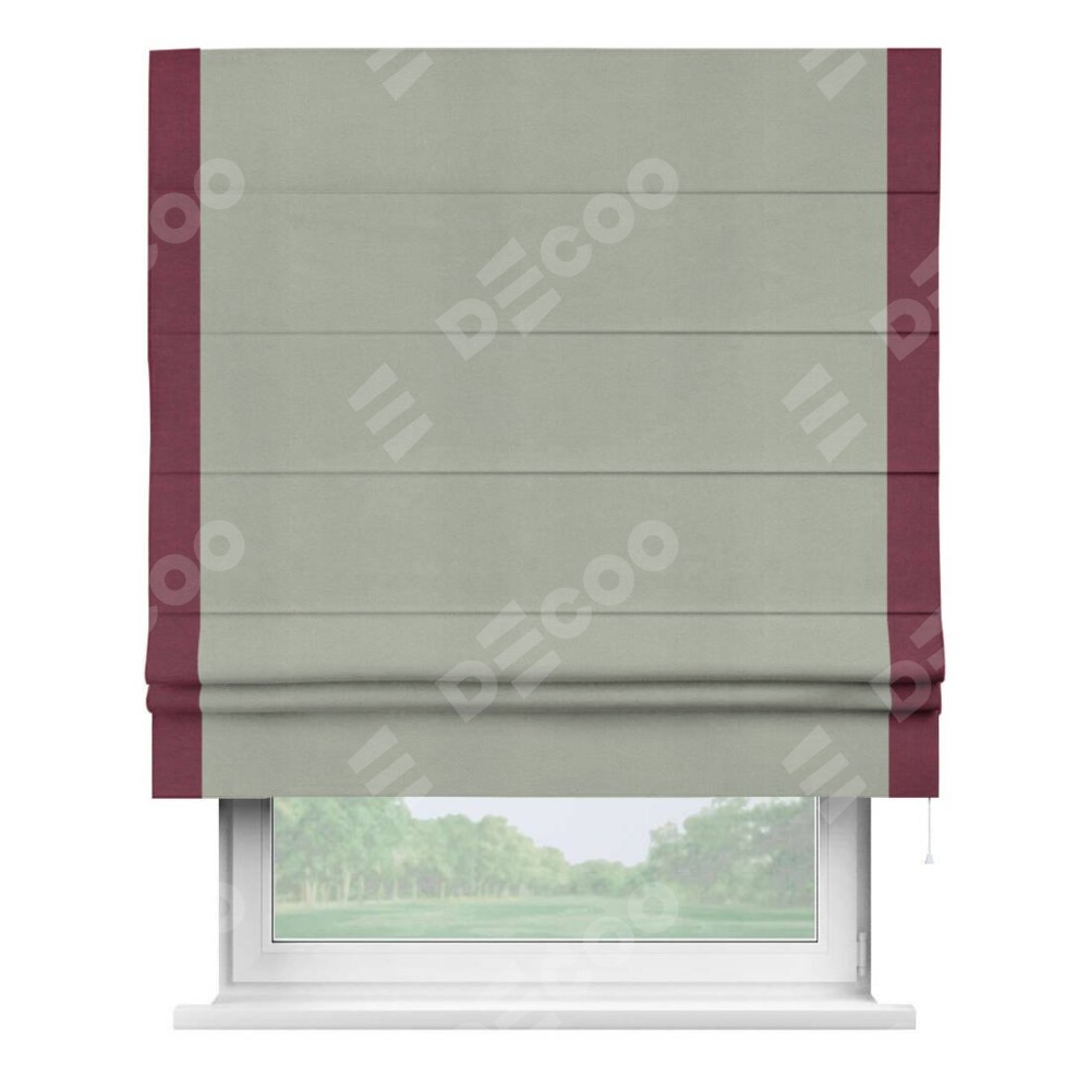 Римская штора производителя «Cortin», используется для проёма, пошита из ткани вельвет cветло-серый, артикул ткани 30981. Отделка шторы кантом «Стрим Дуо», ткань для канта используется из вельвета разной расцветки на выбор. Имеет универсальный механизм и подходит для монтажа: на потолок, на стену и в нишу.