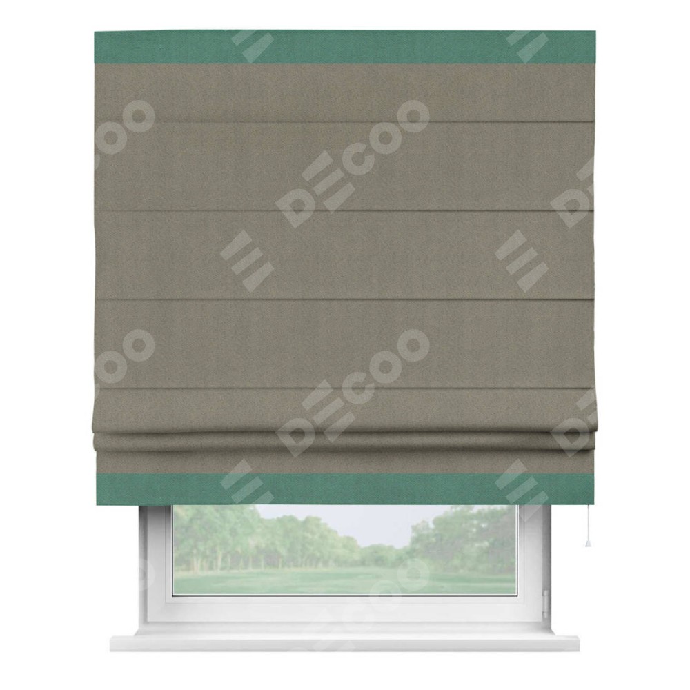 Римская штора производителя «Cortin», используется для проёма, пошита из ткани блэкаут с блеском графитовый, артикул 34648. Отделка шторы кантом «Горизонт», ткань для канта используется из блэкаута с блеском разной расцветки на выбор. Изнаночная сторона материала черного цвета, что обеспечивает необходимую светонепроницаемость. Имеет универсальный механизм и подходит для монтажа: на потолок, на стену и в нишу.