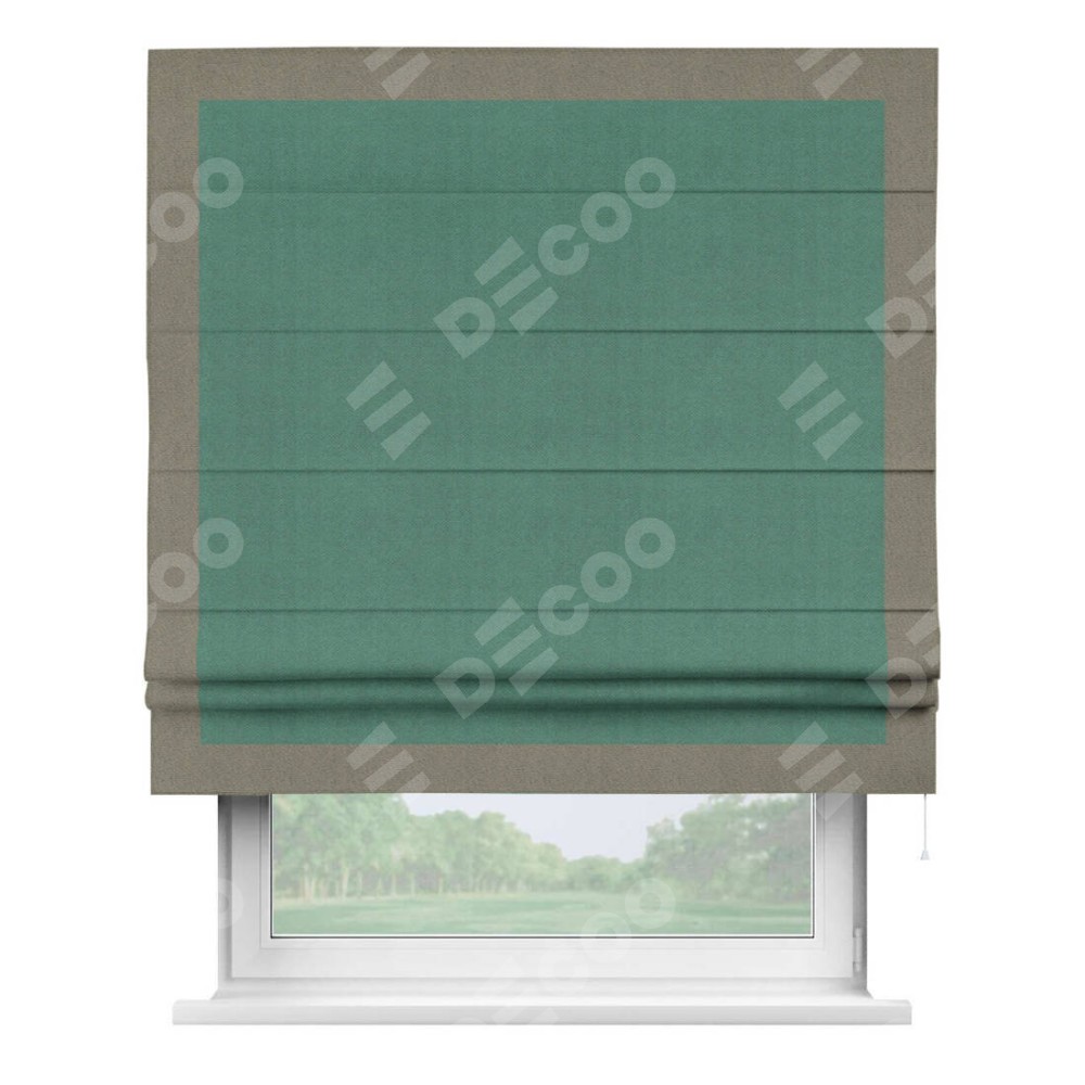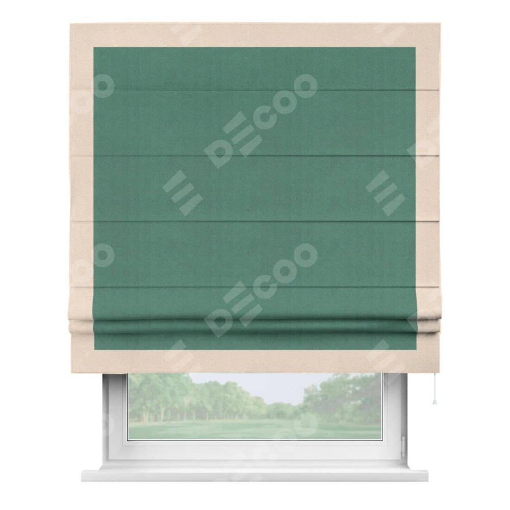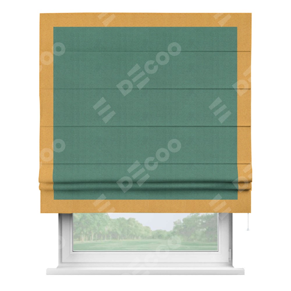 Римская штора производителя «Cortin», используется для проёма, пошита из ткани блэкаут с блеском изумрудный, артикул 34628. Отделка шторы кантом «Чесс», ткань для канта используется из блэкаута с блеском разной расцветки на выбор. Изнаночная сторона материала черного цвета, что обеспечивает необходимую светонепроницаемость. Имеет универсальный механизм и подходит для монтажа: на потолок, на стену и в нишу.
