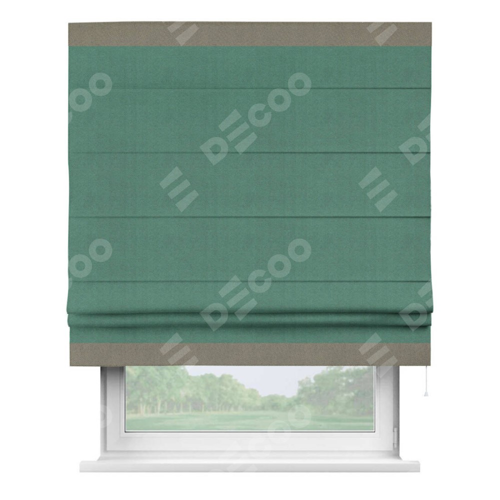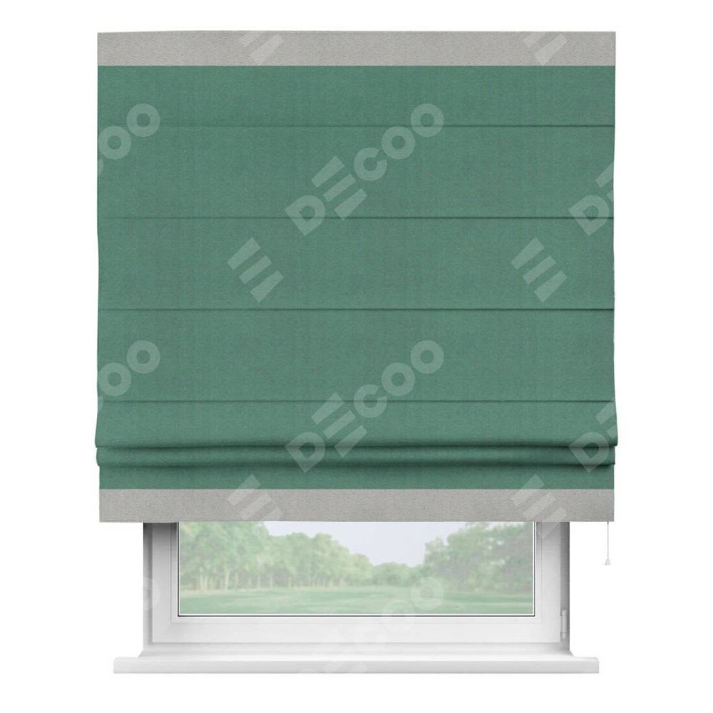 Римская штора производителя «Cortin», используется для проёма, пошита из ткани блэкаут с блеском изумрудный, артикул 34628. Отделка шторы кантом «Горизонт», ткань для канта используется из блэкаута с блеском разной расцветки на выбор. Изнаночная сторона материала черного цвета, что обеспечивает необходимую светонепроницаемость. Имеет универсальный механизм и подходит для монтажа: на потолок, на стену и в нишу.