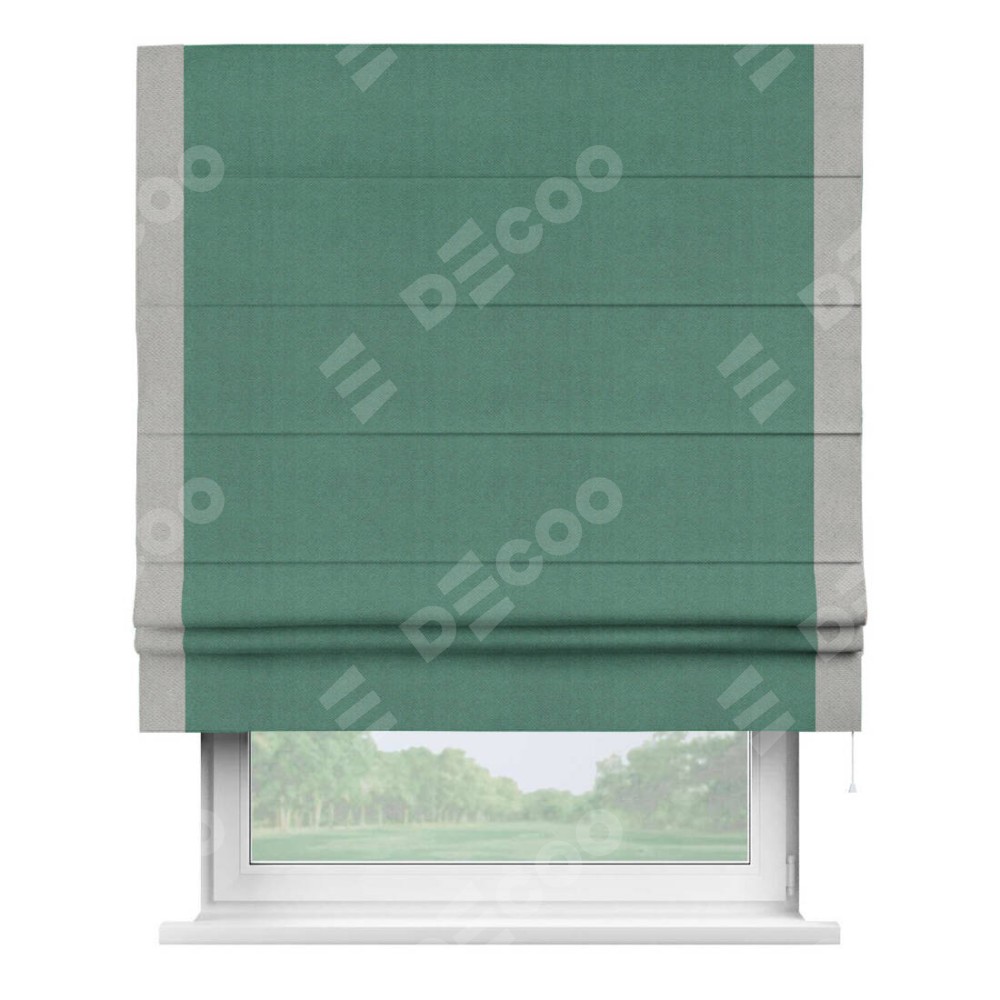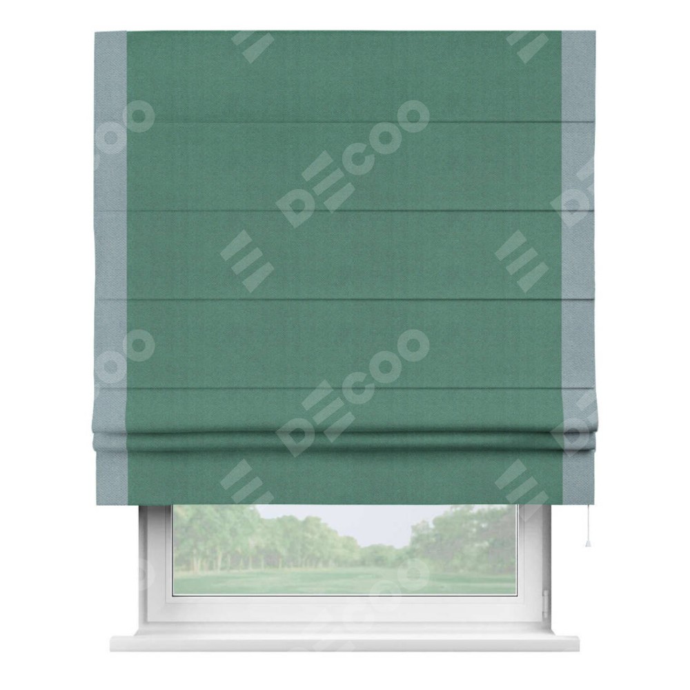 Римская штора производителя «Cortin», используется для проёма, пошита из ткани блэкаут с блеском изумрудный, артикул 34628. Отделка шторы кантом «Стрим Дуо», ткань для канта используется из блэкаута с блеском разной расцветки на выбор. Изнаночная сторона материала черного цвета, что обеспечивает необходимую светонепроницаемость. Имеет универсальный механизм и подходит для монтажа: на потолок, на стену и в нишу.