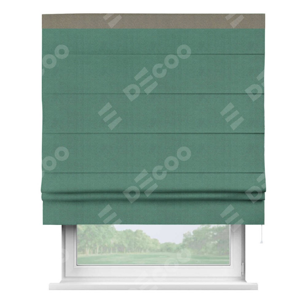 Римская штора производителя «Cortin», используется для проёма, пошита из ткани блэкаут с блеском изумрудный, артикул 34628. Отделка шторы кантом «Кинг», ткань для канта используется из блэкаута с блеском разной расцветки на выбор. Изнаночная сторона материала черного цвета, что обеспечивает необходимую светонепроницаемость. Имеет универсальный механизм и подходит для монтажа: на потолок, на стену и в нишу.