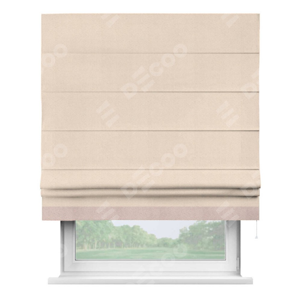 Римская штора производителя «Cortin», используется для проёма, пошита из ткани блэкаут с блеском розовая пудра, артикул 34632. Отделка шторы кантом «Джестер», ткань для канта используется из блэкаута с блеском разной расцветки на выбор. Изнаночная сторона материала черного цвета, что обеспечивает необходимую светонепроницаемость. Имеет универсальный механизм и подходит для монтажа: на потолок, на стену и в нишу.