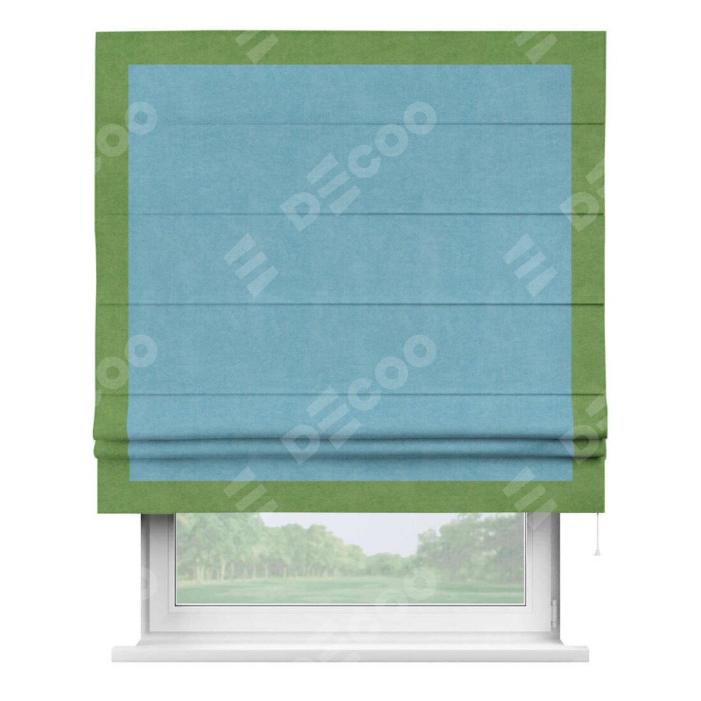 Римская штора производителя «Cortin», используется для проёма, пошита из ткани вельвет ментоловый, артикул ткани 10443. Отделка шторы кантом «Чесс», ткань для канта используется из вельвета разной расцветки на выбор. Имеет универсальный механизм и подходит для монтажа: на потолок, на стену и в нишу.