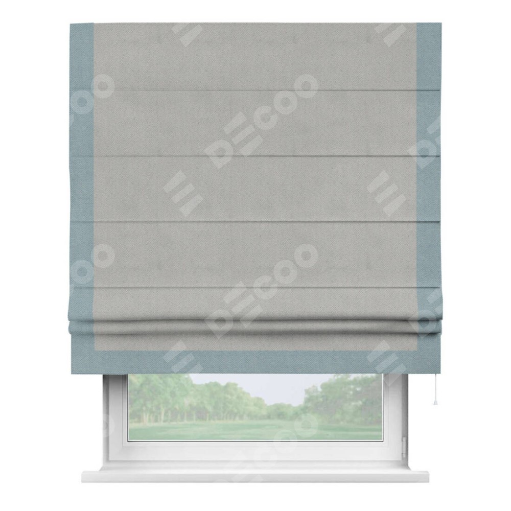 Римская штора производителя «Cortin», используется для проёма, пошита из ткани блэкаут с блеском тёмно-серый, артикул 34634. Отделка шторы кантом «Виктория», ткань для канта используется из блэкаута с блеском разной расцветки на выбор. Изнаночная сторона материала черного цвета, что обеспечивает необходимую светонепроницаемость. Имеет универсальный механизм и подходит для монтажа: на потолок, на стену и в нишу.