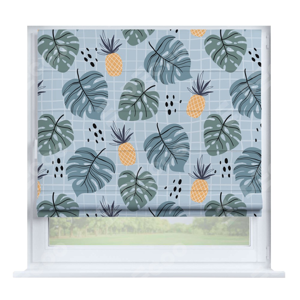 Римская штора производителя «Cortin», устанавливается на створку окна, пошита из ткани блэкаут с нанесением сублимационной печати «Ананасы и листья монстеры». Штора шьётся по индивидуальным размерам, для данного типа римской шторы возможная ширина от 35 до 150 см., высота до 250 см.