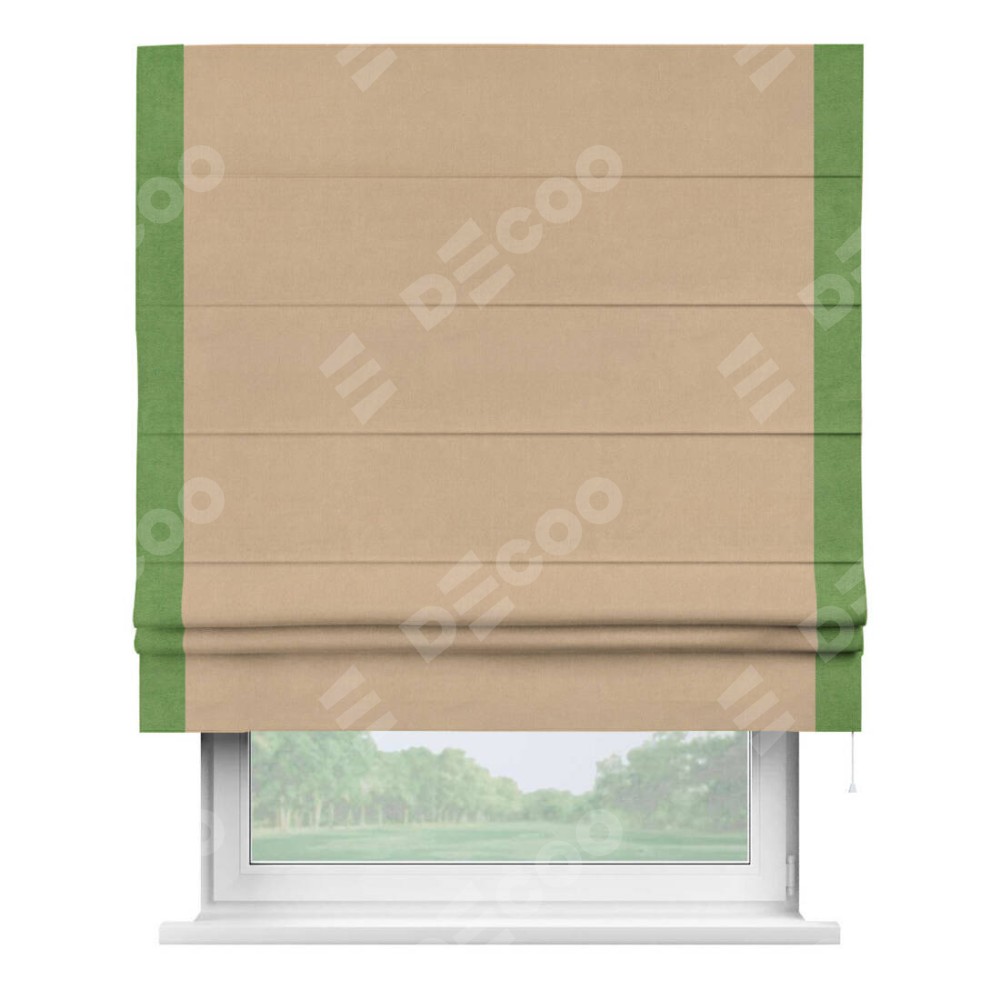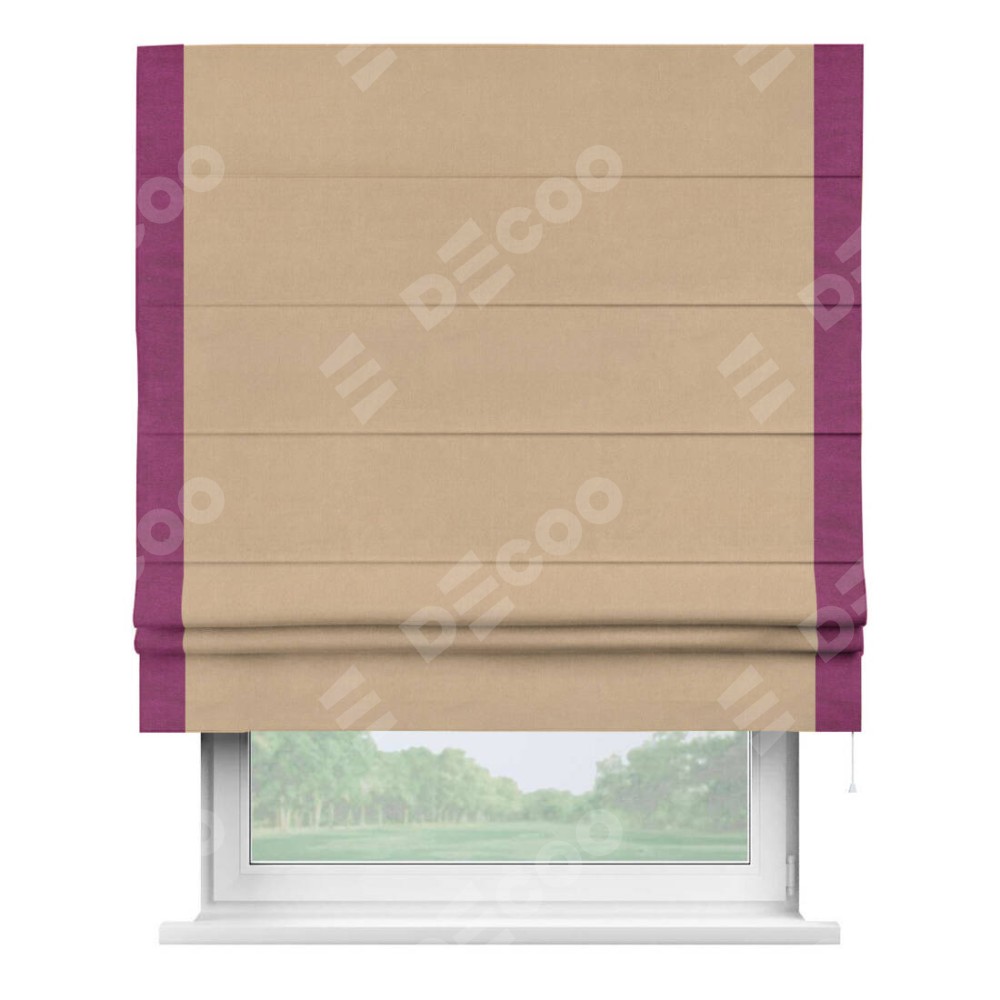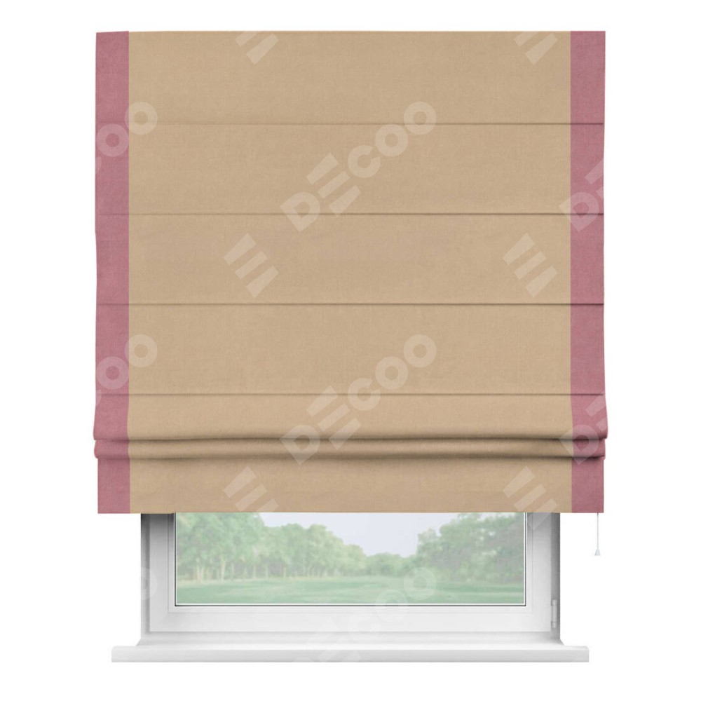 Римская штора производителя «Cortin», используется для проёма, пошита из ткани вельвет песочный, артикул ткани 17740. Отделка шторы кантом «Стрим Дуо», ткань для канта используется из вельвета разной расцветки на выбор. Имеет универсальный механизм и подходит для монтажа: на потолок, на стену и в нишу.