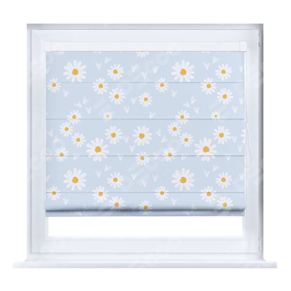 Римская штора производителя «Cortin», устанавливается на створку окна, пошита из ткани блэкаут с нанесением сублимационной печати «Летние ромашки». Штора шьётся по индивидуальным размерам, для данного типа римской шторы возможная ширина от 35 до 150 см., высота до 250 см.