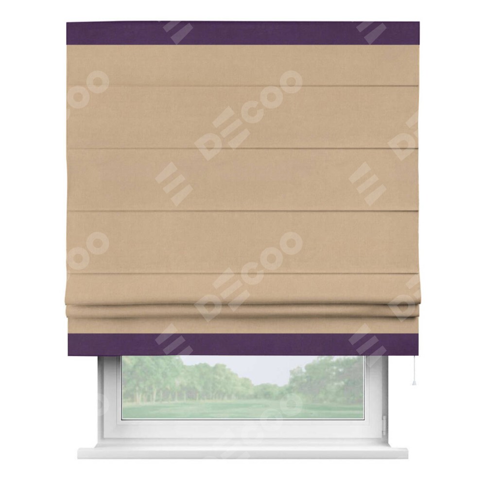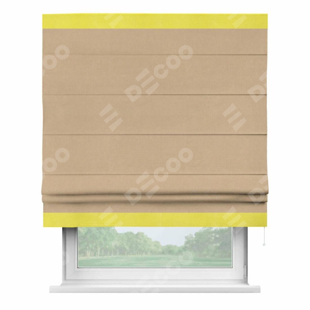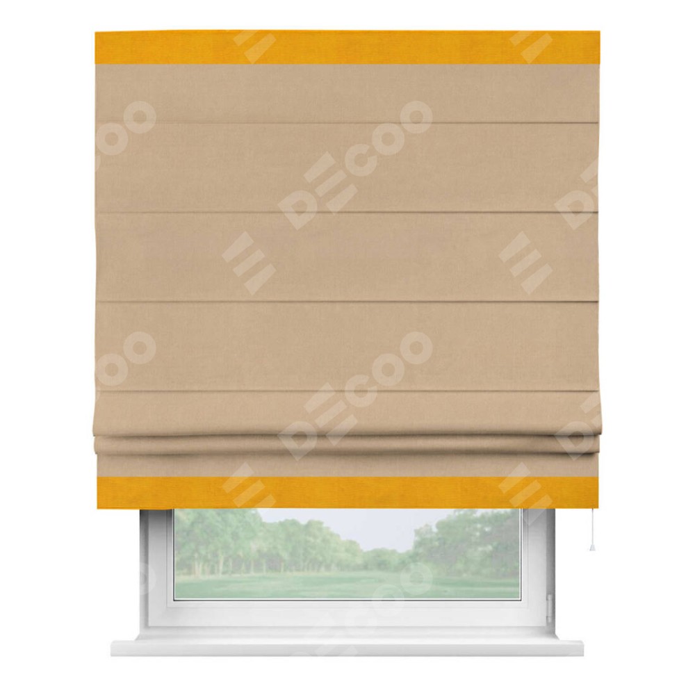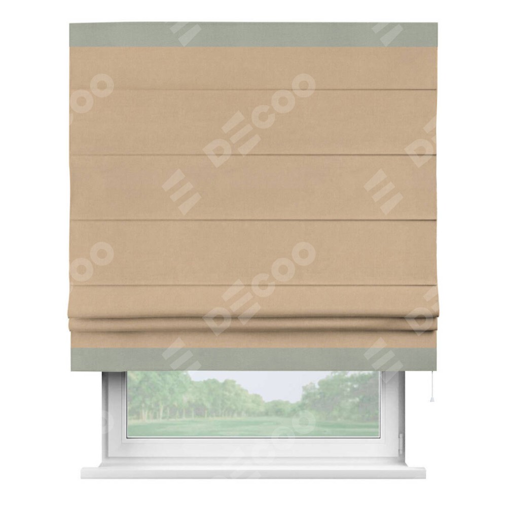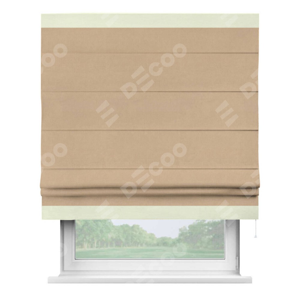Римская штора производителя «Cortin», используется для проёма, пошита из ткани вельвет песочный, артикул ткани 17740. Отделка шторы кантом «Горизонт», ткань для канта используется из вельвета разной расцветки на выбор. Имеет универсальный механизм и подходит для монтажа: на потолок, на стену и в нишу.