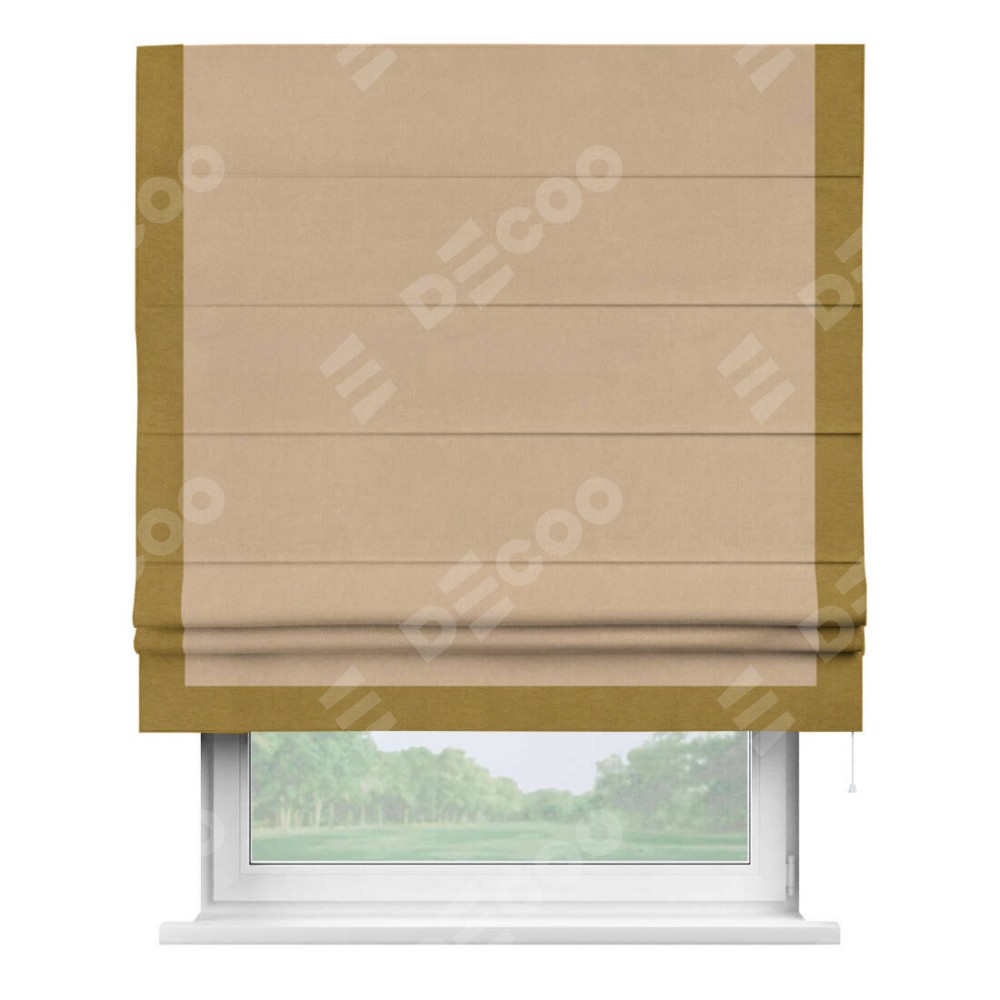 Римская штора производителя «Cortin», используется для проёма, пошита из ткани вельвет песочный, артикул ткани 17740. Отделка шторы кантом «Виктория», ткань для канта используется из вельвета разной расцветки на выбор. Имеет универсальный механизм и подходит для монтажа: на потолок, на стену и в нишу.