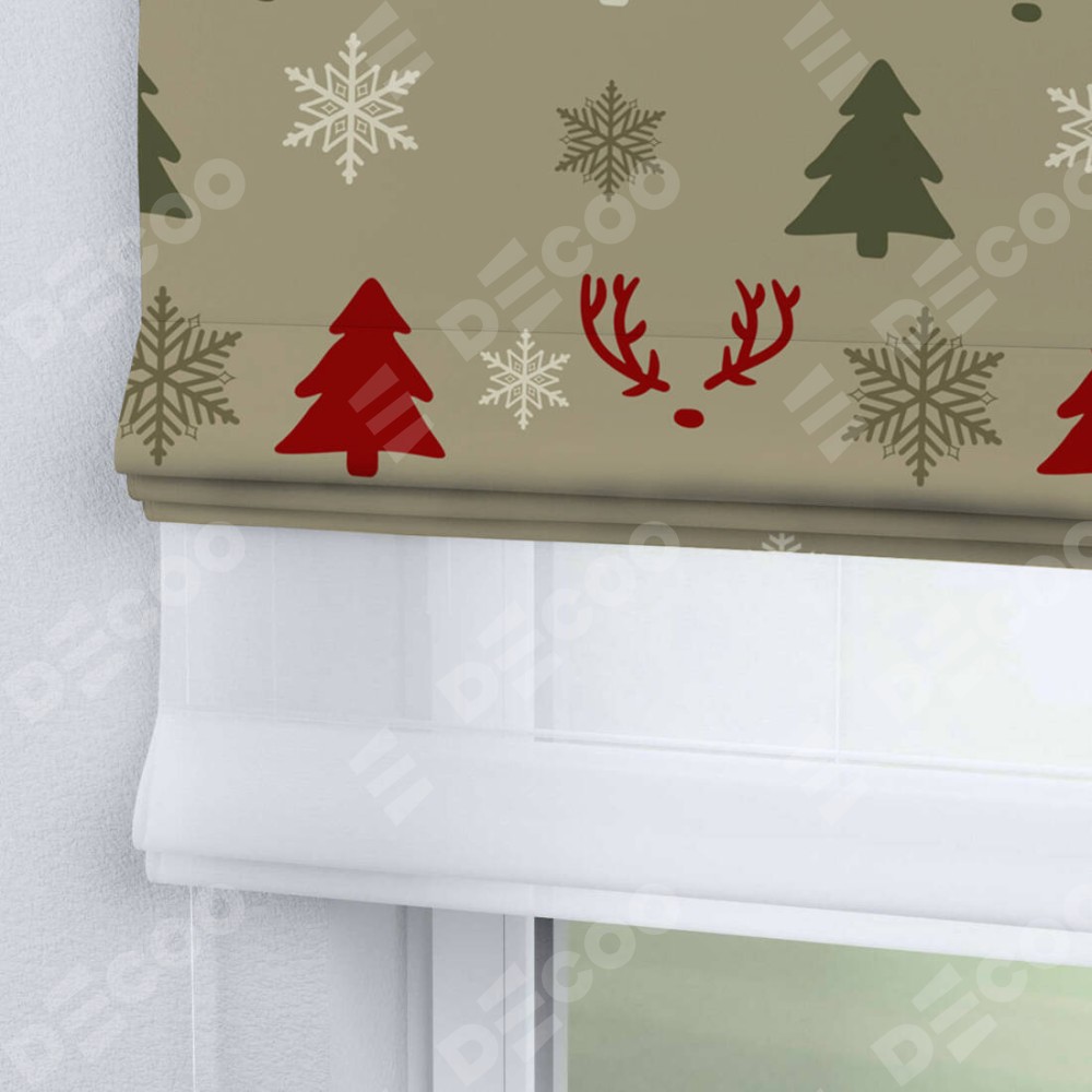Римская штора день-ночь производителя «Cortin», используется для проёма, пошита из двух полотен, с лицевой блэкаут с нанесением сублимационной печати «Гармония рождества», вторая ткань тюль (по стандарту комплектуется тюль белого цвета артикул V-01). Имеет универсальный механизм и подходит для монтажа: на потолок, на стену и в нишу.
