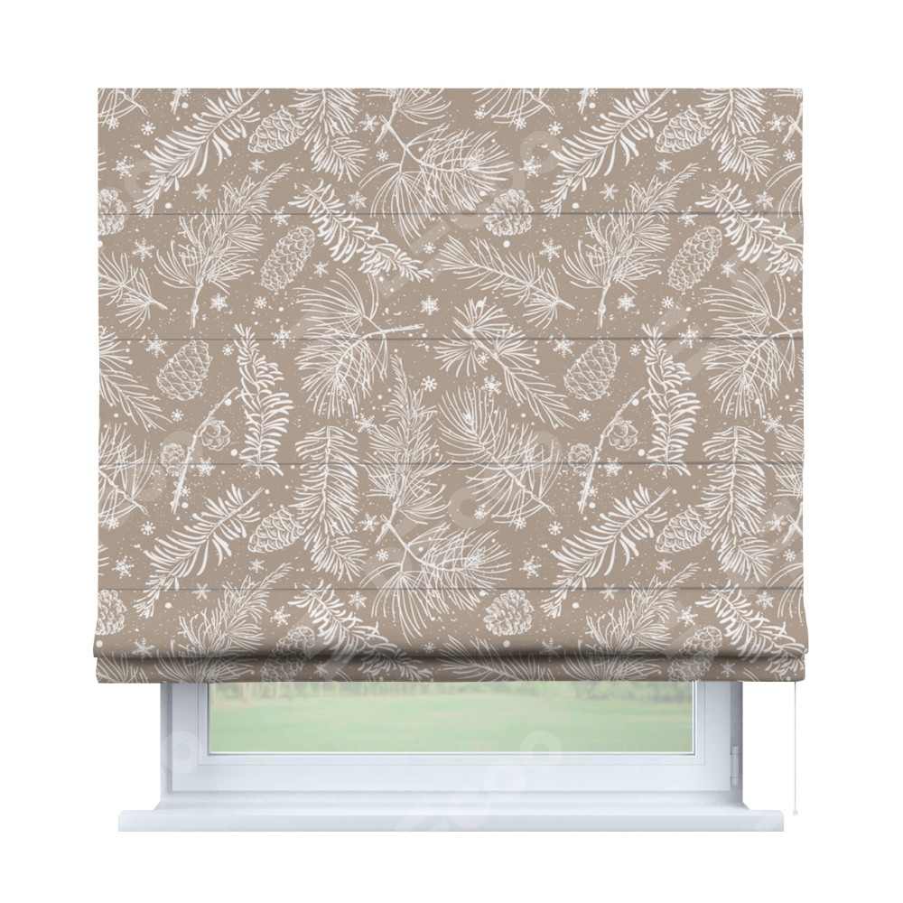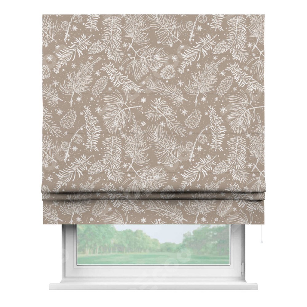 Римская штора производителя «Cortin», используется для проёма, пошита из ткани блэкаут с нанесением сублимационной печати «Заснеженный лес». Имеет универсальный механизм и подходит для монтажа: на потолок, на стену и в нишу.