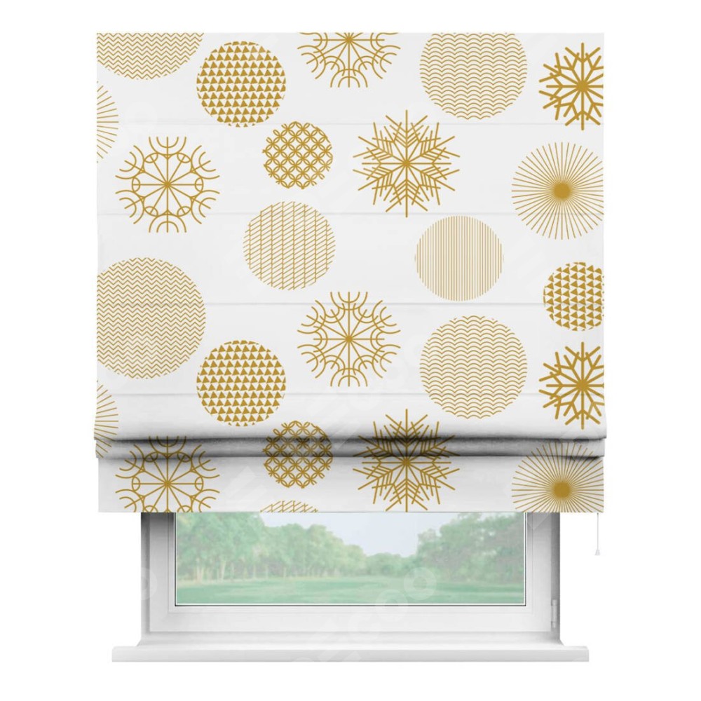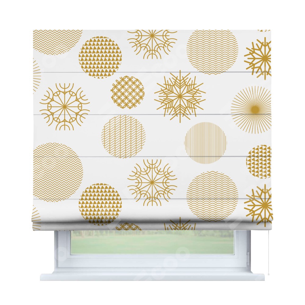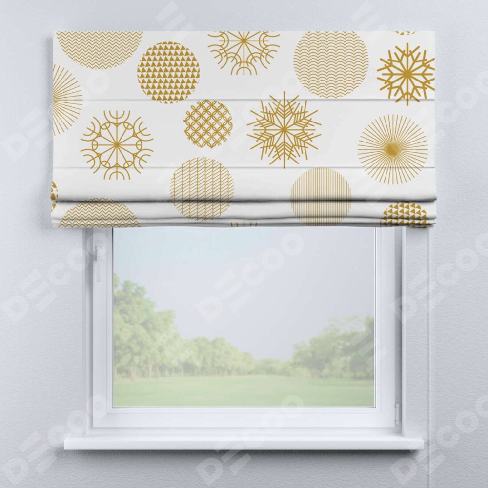 Римская штора производителя «Cortin», используется для проёма, пошита из ткани блэкаут с нанесением сублимационной печати «Золотые шары». Имеет универсальный механизм и подходит для монтажа: на потолок, на стену и в нишу.